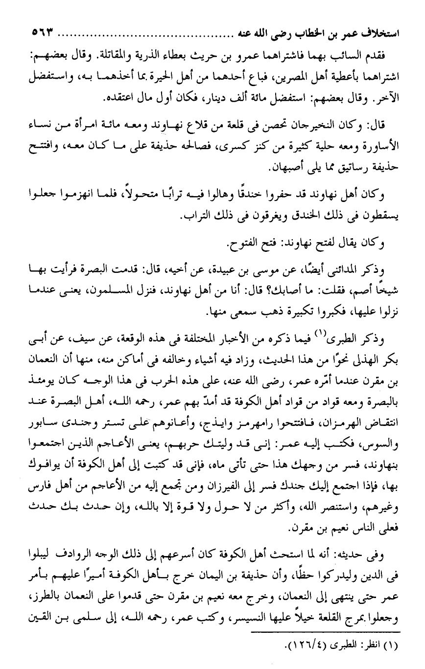 وذكر الطبرى «1» فيما ذكره من الأخبار المختلفة فى هذه الوقعة، عن سيف، عن أبى بكر الهذلى نحوا من هذا الحديث، وزاد فيه أشياء وخالفه فى أماكن منه، منها أن النعمان بن مقرن عند ما أمّره عمر، رضى الله عنه، على هذه الحرب فى هذا الوجه كان يومئذ بالبصرة ومعه قواد من قواد أهل الكوفة قد أمدّ بهم عمر، رحمه الله، أهل البصرة عند انتقاض الهرمزان، فافتتحوا رامهرمز وايذج، وأعانوهم على تستر وجندى سابور والسوس، فكتب إليه عمر: إنى قد وليتك حربهم، يعنى الأعاجم الذين اجتمعوا بنهاوند، فسر من وجهك هذا حتى تأتى ماه، فإنى قد كتبت إلى أهل الكوفة أن يوافوك بها، فإذا اجتمع إليك جندك فسر إلى الفيرزان ومن تجمع إليه من الأعاجم من أهل فارس وغيرهم، واستنصر الله، وأكثر من لا حول ولا قوة إلا بالله، وإن حدث بك حدث فعلى الناس نعيم بن مقرن.