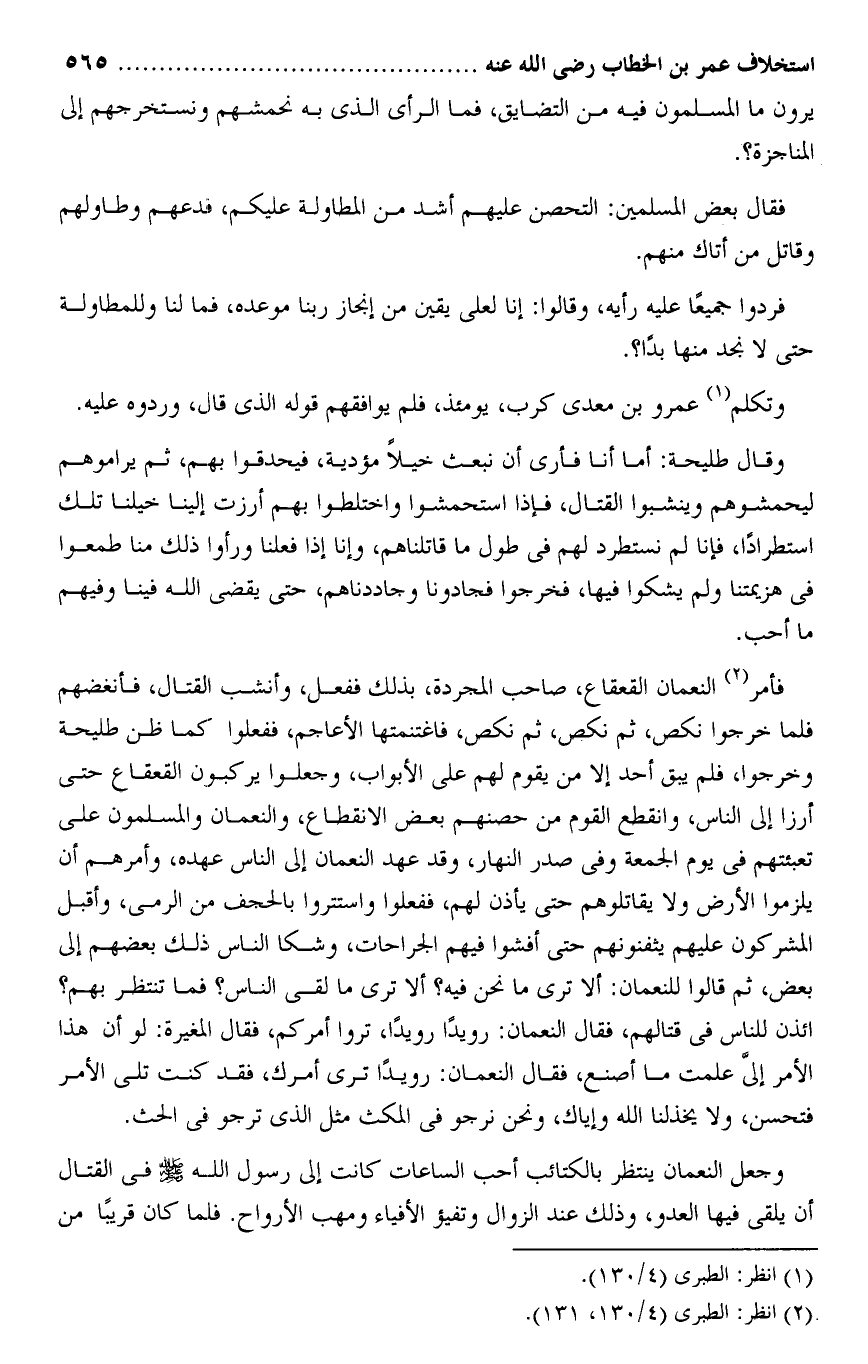 ائذن للناس فى قتالهم، فقال النعمان: رويدا رويدا، تروا أمركم، فقال المغيرة: لو أن هذا الأمر إلىّ علمت ما أصنع، فقال النعمان: رويدا ترى أمرك، فقد كنت تلى الأمر فتحسن، ولا يخذلنا الله وإياك، ونحن نرجو فى المكث مثل الذى ترجو فى الحث.