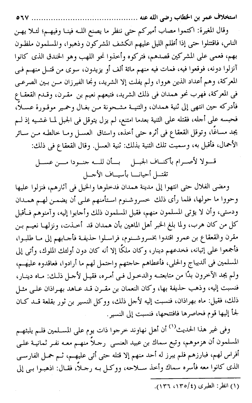 وقال المغيرة: اكتموا مصاب أميركم حتى ننظر ما يصنع الله فينا وفيهم؛ لئلا يهن الناس، فاقتتلوا حتى إذا أظلم الليل عليهم انكشف المشركون وذهبوا، والمسلمون ملظون بهم، فعمى على المشركين قصدهم، فتركوه وأخذوا نحو اللهب وهو الخندق الذى كانوا آنزلوا دونه، فوقعوا فيه، فمات فيه منهم مائة ألف أو يزيدون، سوى من قتل منهم فى المعركة، وهم أعداد الذين هووا، ولم يفلت إلا الشريد، ونجا الفيرزان من بين الصرعى فى المعركة، فهرب نحو همدان فى ذلك الشريد، فتبعهم نعيم بن مقرن، وقدم القعقاع فأدركه حين انتهى إلى ثنية همدان، والثنية مشحونة من بغال وحمير موقورة عسلا، فحبسه على أجله، فقتله على الثنية بعد ما امتنع، لم يزل يتوقل فى الجبل لما غشيه إذ لم يجد مساغا، وتوقل القعقاع فى أثره حتى أخذه، واستاق العسل وما خالطه من سائر الأحمال، فأقبل به، وسميت تلك الثنية بذلك: ثنية العسل. وقال القعقاع فى ذلك: