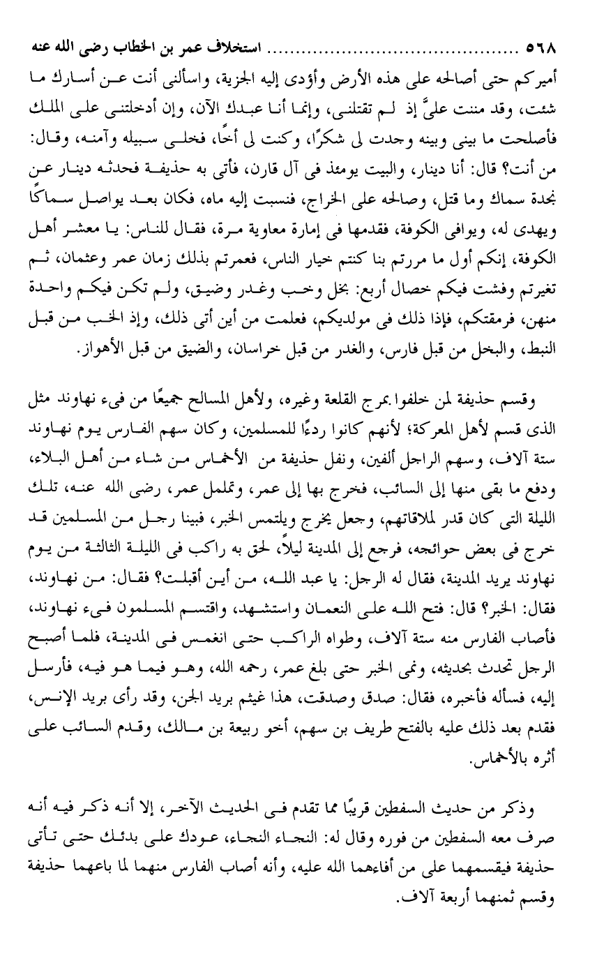وقسم حذيفة لمن خلفوا بمرج القلعة وغيره، ولأهل المسالح جميعا من فىء نهاوند مثل الذى قسم لأهل المعركة؛ لأنهم كانوا ردآ للمسلمين، وكان سهم الفارس يوم نهاوند ستة آلاف، وسهم الراجل ألفين، ونفل حذيفة من الأخماس من شاء من أهل البلاء، ودفع ما بقى منها إلى السائب، فخرج بها إلى عمر، وتململ عمر، رضى الله عنه، تلك الليلة التى كان قدر لملاقاتهم، وجعل يخرج ويلتمس الخبر، فبينا رجل من المسلمين قد خرج فى بعض حوائجه، فرجع إلى المدينة ليلا، لحق به راكب فى الليلة الثالثة من يوم نهاوند يريد المدينة، فقال له الرجل: يا عبد الله، من أين أقبلت؟ فقال: من نهاوند، فقال: الخبر؟ قال: فتح الله على النعمان واستشهد، واقتسم المسلمون فىء نهاوند، فأصاب الفارس منه ستة آلاف، وطواه الراكب حتى انغمس فى المدينة، فلما أصبح الرجل تحدث بحديثه، ونمى الخبر حتى بلغ عمر، رحمه الله، وهو فيما هو فيه، فأرسل إليه، فسأله فأخبره، فقال: صدق وصدقت، هذا غيثم بريد الجن، وقد رأى بريد الإنس، فقدم بعد ذلك عليه بالفتح طريف بن سهم، أخو ربيعة بن مالك، وقدم السائب على أثره بالأخماس.