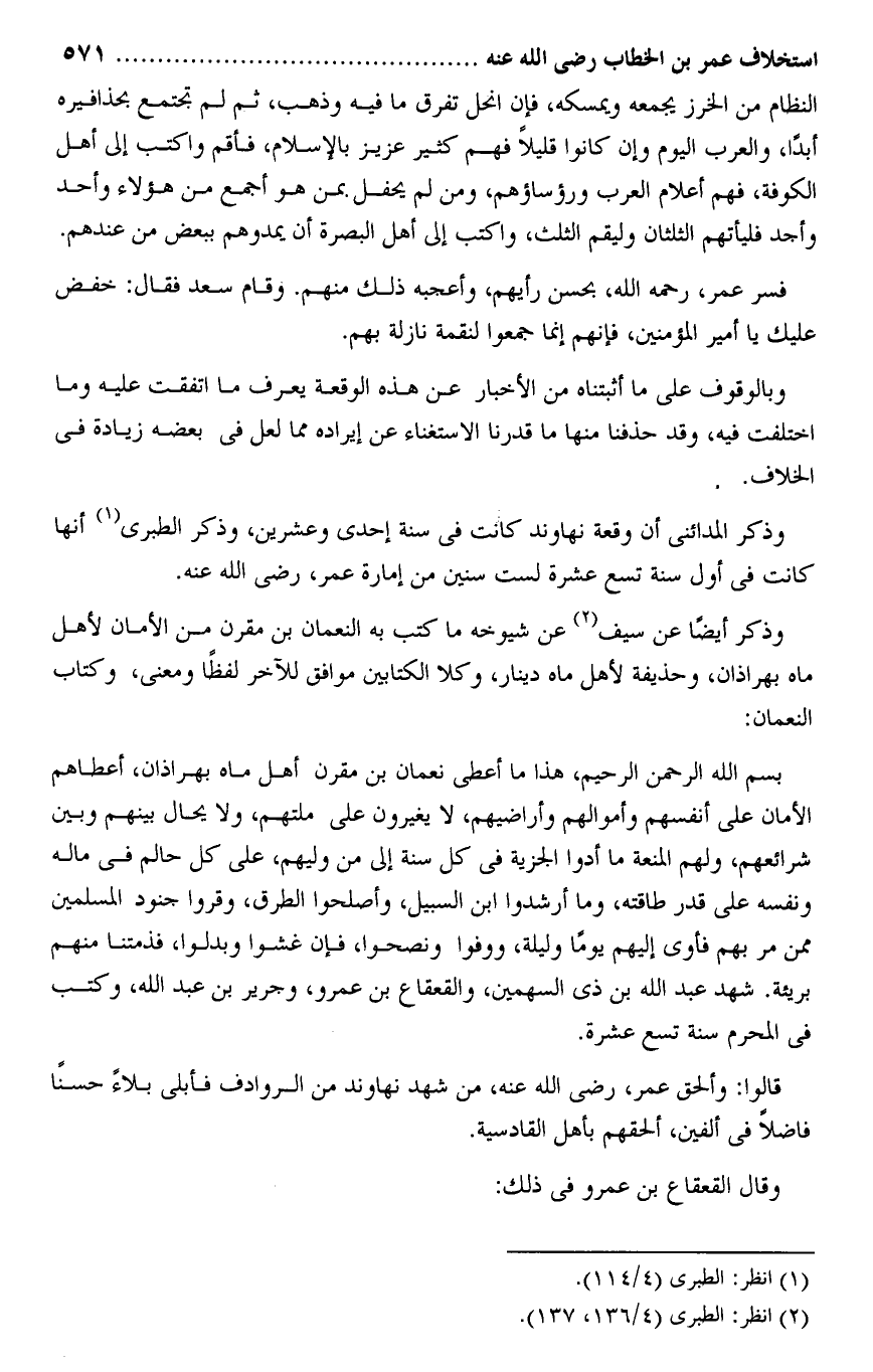بسم الله الرحمن الرحيم، هذا ما أعطى نعمان بن مقرن أهل ماه بهراذان، أعطاهم الأمان على أنفسهم وأموالهم وأراضيهم، لا يغيرون على ملتهم، ولا يحال بينهم وبين شرائعهم، ولهم المنعة ما أدوا الجزية فى كل سنة إلى من وليهم، على كل حالم فى ماله ونفسه على قدر طاقته، وما أرشدوا ابن السبيل، وأصلحوا الطرق، وقروا جنود المسلمين ممن مر بهم فأوى إليهم يوما وليلة، ووفوا ونصحوا، فإن غشوا وبدلوا، فذمتنا منهم بريئة. شهد عبد الله بن ذى السهمين، والقعقاع بن عمرو، وجرير بن عبد الله، وكتب فى المحرم سنة تسع عشرة.
