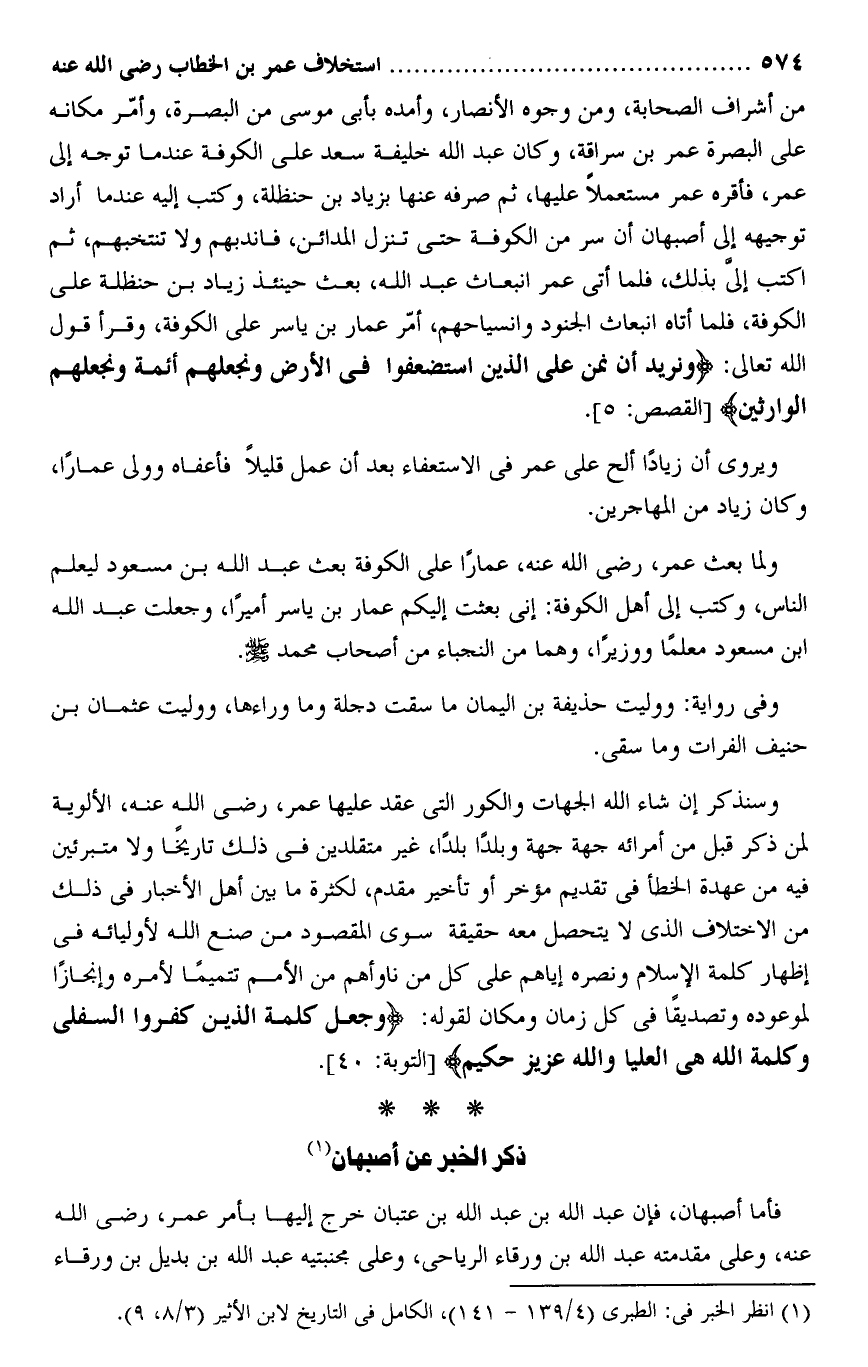 وسنذكر إن شاء الله الجهات والكور التى عقد عليها عمر، رضى الله عنه، الألوية لمن ذكر قبل من أمرائه جهة جهة وبلدا بلدا، غير متقلدين فى ذلك تاريخا ولا متبرئين فيه من عهدة الخطأ فى تقديم مؤخر أو تأخير مقدم، لكثرة ما بين أهل الأخبار فى ذلك من الاختلاف الذى لا يتحصل معه حقيقة سوى المقصود من صنع الله لأوليائه فى إظهار كلمة الإسلام ونصره إياهم على كل من ناوأهم من الأمم تتميما لأمره وإنجازا لموعوده وتصديقا فى كل زمان ومكان لقوله: وَجَعَلَ كَلِمَةَ الَّذِينَ كَفَرُوا السُّفْلى وَكَلِمَةُ اللَّهِ هِيَ الْعُلْيا وَاللَّهُ عَزِيزٌ حَكِيمٌ [التوبة: 40] .
