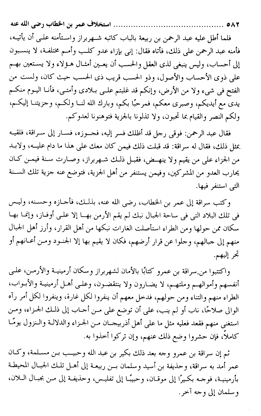 واكتتبوا من سراقة بن عمرو كتابا بالأمان لشهربراز وسكان أرمينية والأرمن، على أنفسهم وأموالهم وملتهم، لا يضارون ولا ينتقضون، وعلى أهل أرمينية والأبواب، الطراء منهم والتناء ومن حولهم، فدخل معهم أن ينفروا لكل غارة، وينفروا لكل أمر رآه الوالى صلاحا، ناب أو لم ينب، على أن توضع على من أجاب إلى ذلك الجزاء، ومن استغنى منهم فقعد فعليه مثل ما على أهل أذربيجان من الجزاء والدلالة والنزول يوما كاملا، فإن حشروا وضع ذلك عنهم، وإن تركوا أخذوا به.