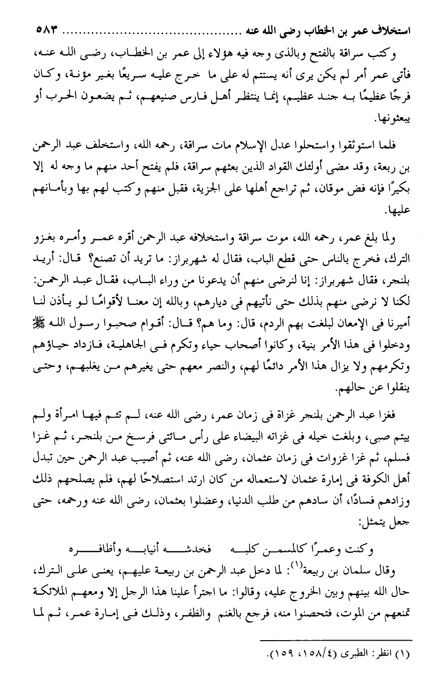 وكتب سراقة بالفتح وبالذى وجه فيه هؤلاء إلى عمر بن الخطاب، رضى الله عنه، فأتى عمر أمر لم يكن يرى أنه يستتم له على ما خرج عليه سريعا بغير مؤنة، وكان فرجا عظيما به جند عظيم، إنما ينتظر أهل فارس صنيعهم، ثم يضعون الحرب أو يبعثونها.