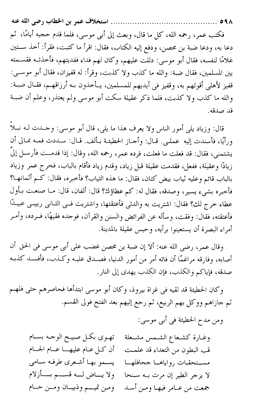 قال: وزياد يلى أمور الناس ولا يعرف هذا ما يلى، قال أبو موسى: وجدت له نبلا ورأيا، فأسندت إليه عملى. قال: وأجاز الحطيئة بألف. قال: سددت فمه بمالى أن يشتمنى، فقال: قد فعلت ما فعلت، فرده عمر، رحمه الله، وقال: إذا قدمت فأرسل إلىّ زيادا وعقيلة، ففعل، فقدمت عقيلة قبل زياد، وقدم زياد فأقام بالباب، فخرج عمر وزياد بالباب قائم وعليه ثياب بيض كتان، فقال: ما هذه الثياب؟ فأخبره، فقال: كم أثمانها؟