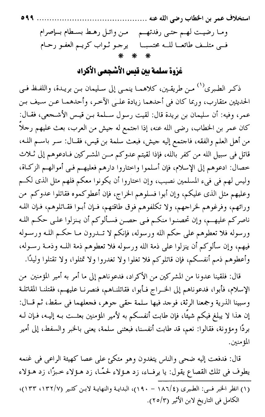 كان عمر بن الخطاب، رضى الله عنه، إذا اجتمع له جيش من العرب، بعث عليهم رجلا من أهل العلم والفقه، فاجتمع إليه جيش، فبعث سلمة بن قيس، فقال: سر باسم الله، قاتل فى سبيل الله من كفر بالله، فإذا لقيتم عدوكم من المشركين فادعوهم إلى ثلاث خصال: ادعوهم إلى الإسلام، فإن أسلموا واختاروا دارهم فعليهم فى أموالهم الزكاة، وليس لهم فى فىء المسلمين نصيب، وإن اختاروا أن يكونوا معكم فلهم مثل الذى لكم وعليهم مثل الذى عليكم، وإن أبوا فسلوهم الخراج، فإن أعطوكموه فقاتلوا عدوكم من ورائهم، وفرغوهم لخراجهم، ولا تكلفوهم فوق طاقتهم، فإن أبوا فقاتلوهم، فإن الله ناصركم عليهم، وإن تحصنوا منكم فى حصن فسألوكم أن ينزلوا على حكم الله ورسوله فلا تعطوهم على حكم الله ورسوله، فإنكم لا تدرون ما حكم الله ورسوله فيهم، وإن سألوكم أن ينزلوا على ذمة الله ورسوله فلا تعطوهم ذمة الله وذمة رسوله، وأعطوهم ذمم أنفسكم، فإن قاتلوكم فلا تغلوا ولا تغدروا ولا تمثلوا، ولا تقتلوا وليدا.