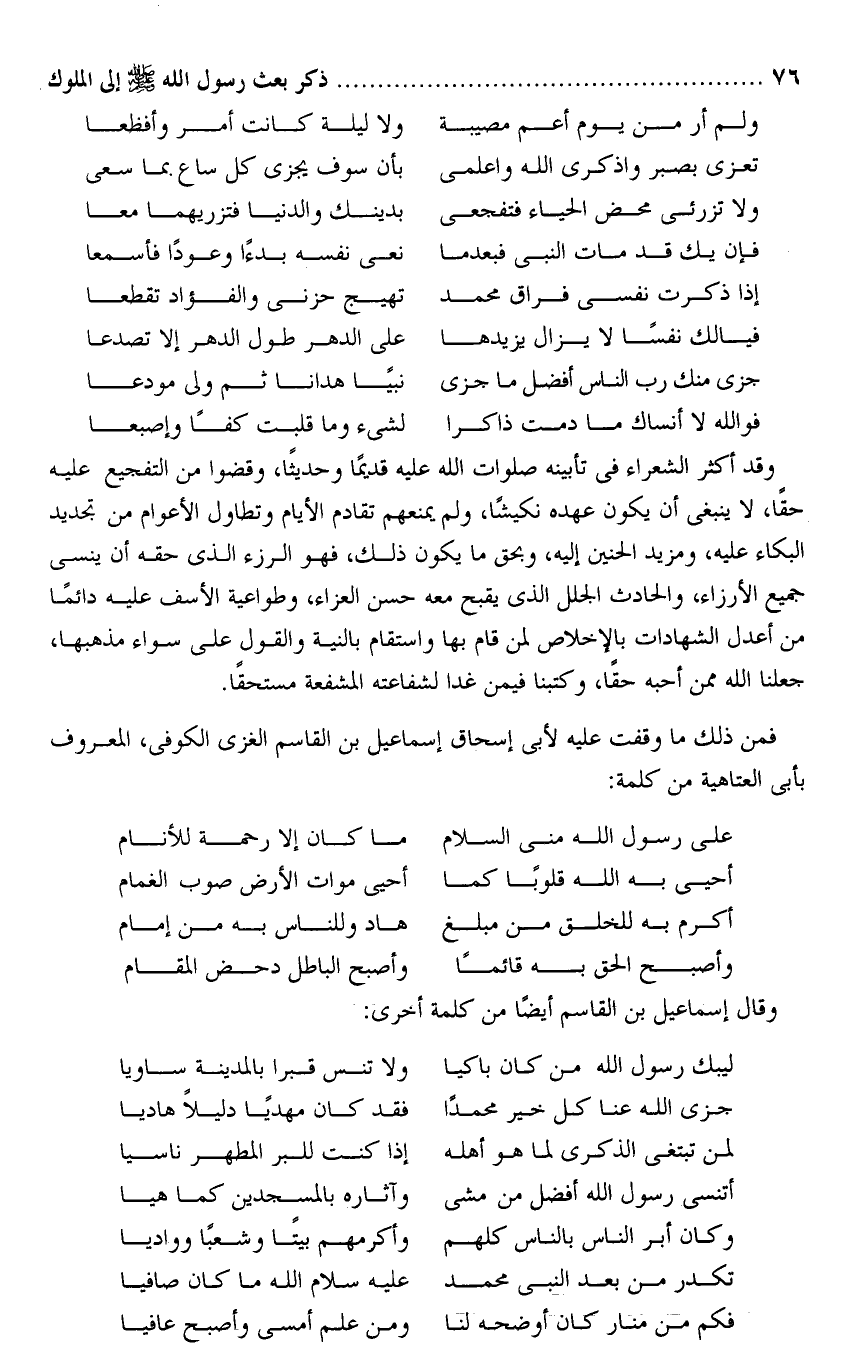 وقد أكثر الشعراء فى تأبينه صلوات الله عليه قديما وحديثا، وقضوا من التفجيع عليه حقا، لا ينبغى أن يكون عهده نكيشا، ولم يمنعهم تقادم الأيام وتطاول الأعوام من تجديد البكاء عليه، ومزيد الحنين إليه، وبحق ما يكون ذلك، فهو الرزء الذى حقه أن ينسى جميع الأرزاء، والحادث الجلل الذى يقبح معه حسن العزاء، وطواعية الأسف عليه دائما من أعدل الشهادات بالإخلاص لمن قام بها واستقام بالنية والقول على سواء مذهبها، جعلنا الله ممن أحبه حقا، وكتبنا فيمن غدا لشفاعته المشفعة مستحقا.