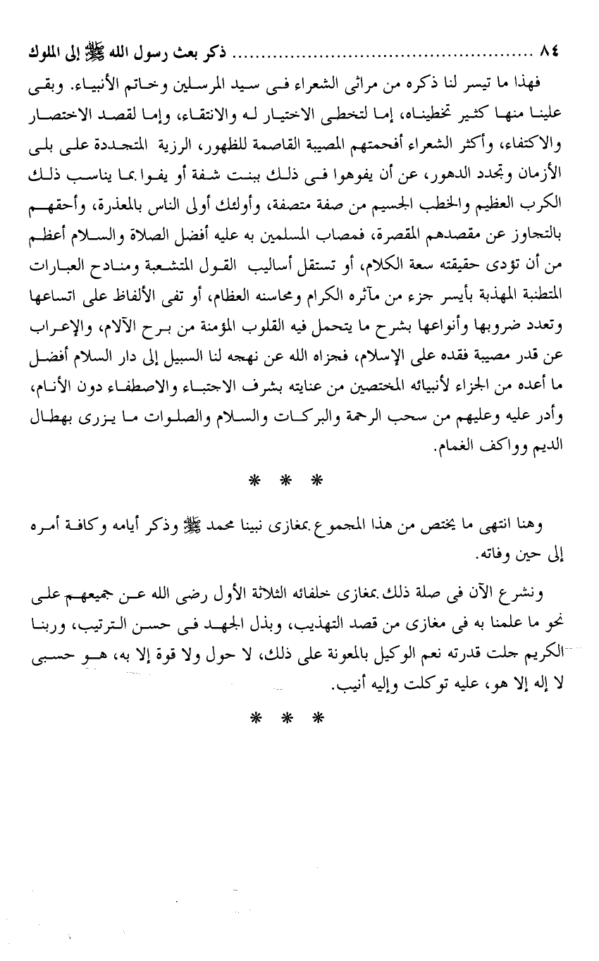 فهذا ما تيسر لنا ذكره من مراثى الشعراء فى سيد المرسلين وخاتم الأنبياء. وبقى علينا منها كثير تخطيناه، إما لتخطى الاختيار له والانتقاء، وإما لقصد الاختصار والاكتفاء، وأكثر الشعراء أفحمتهم المصيبة القاصمة للظهور، الرزية المتجددة على بلى الأزمان وتجدد الدهور، عن أن يفوهوا فى ذلك ببنت شفة أو يفوا بما يناسب ذلك الكرب العظيم والخطب الجسيم من صفة متصفة، وأولئك أولى الناس بالمعذرة، وأحقهم بالتجاوز عن مقصدهم المقصرة، فمصاب المسلمين به عليه أفضل الصلاة والسلام أعظم من أن تؤدى حقيقته سعة الكلام، أو تستقل أساليب القول المتشعبة ومنادح العبارات المتطنبة المهذبة بأيسر جزء من مآثره الكرام ومحاسنه العظام، أو تفى الألفاظ على اتساعها وتعدد ضروبها وأنواعها بشرح ما يتحمل فيه القلوب المؤمنة من برح الآلام، والإعراب عن قدر مصيبة فقده على الإسلام، فجزاه الله عن نهجه لنا السبيل إلى دار السلام أفضل ما أعده من الجزاء لأنبيائه المختصين من عنايته بشرف الاجتباء والاصطفاء دون الأنام، وأدر عليه وعليهم من سحب الرحمة والبركات والسلام والصلوات ما يزرى بهطال الديم وواكف الغمام.