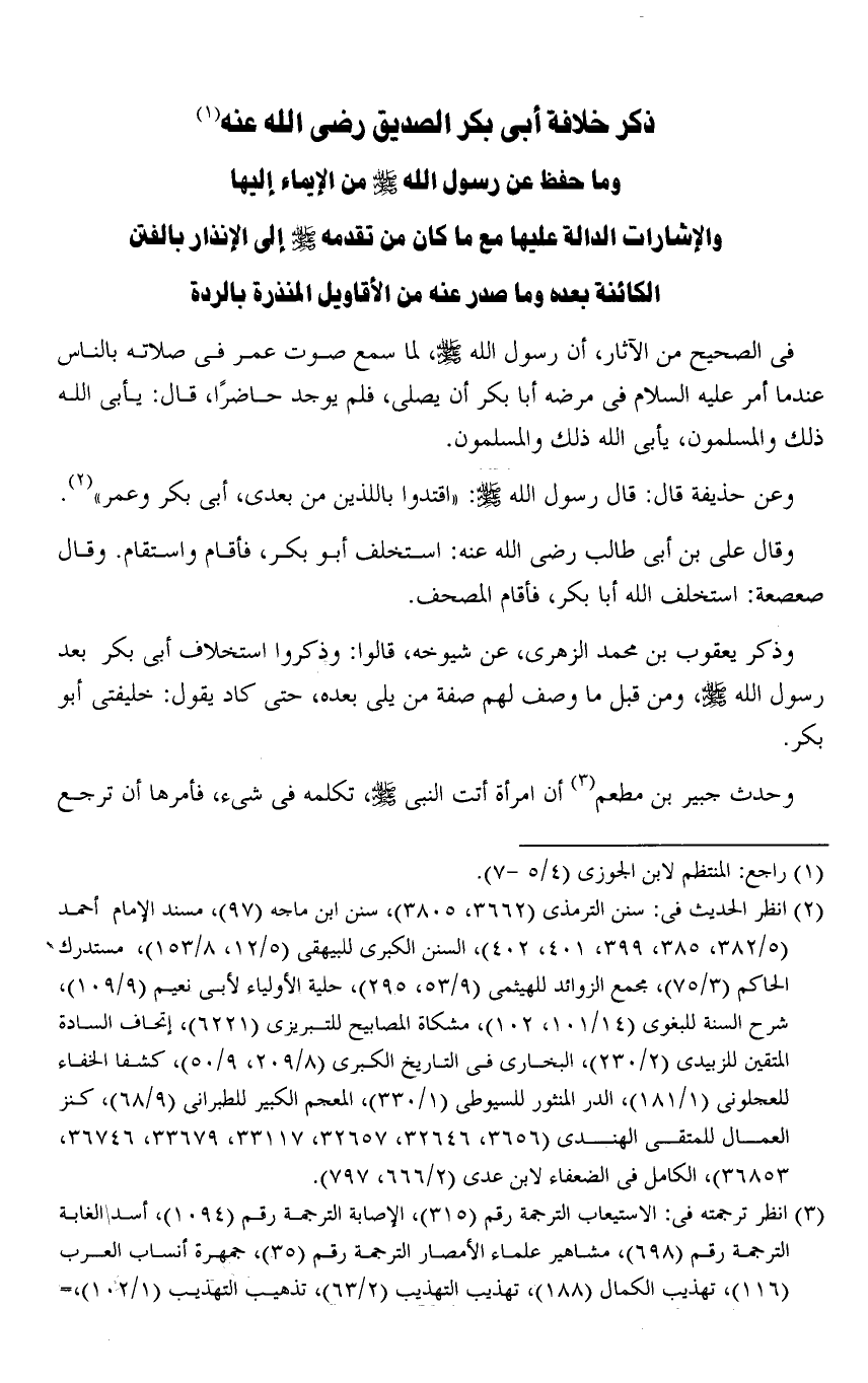 ذكر خلافة أبى بكر الصديق رضى الله عنه «1» وما حفظ عن رسول الله صلى الله عليه وسلم من الإيماء إليها والإشارات الدالة عليها مع ما كان من تقدمه صلى الله عليه وسلم إلى الإنذار بالفتن الكائنة بعده وما صدر عنه من الأقاويل المنذرة بالردة