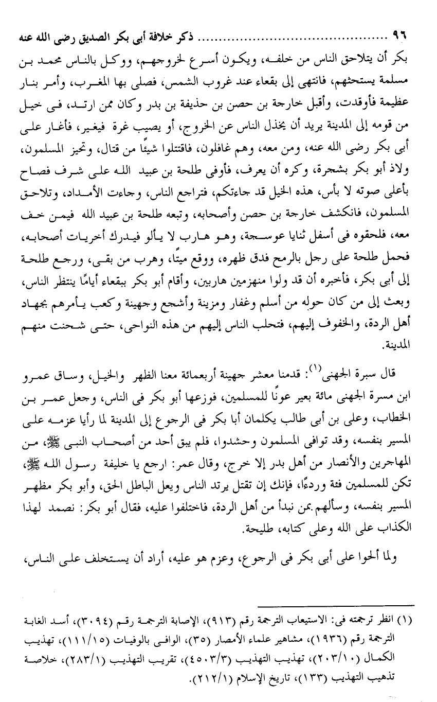 قال سبرة الجهنى «1» : قدمنا معشر جهينة أربعمائة معنا الظهر والخيل، وساق عمرو ابن مسرة الجهنى مائة بعير عونا للمسلمين، فوزعها أبو بكر فى الناس، وجعل عمر بن الخطاب، وعلى بن أبى طالب يكلمان أبا بكر فى الرجوع إلى المدينة لما رأيا عزمه على المسير بنفسه، وقد توافى المسلمون وحشدوا، فلم يبق أحد من أصحاب النبى صلى الله عليه وسلم، من المهاجرين والأنصار من أهل بدر إلا خرج، وقال عمر: ارجع يا خليفة رسول الله صلى الله عليه وسلم، تكن للمسلمين فئة وردآ، فإنك إن تقتل يرتد الناس ويعل الباطل الحق، وأبو بكر مظهر المسير بنفسه، وسألهم بمن نبدأ من أهل الردة، فاختلفوا عليه، فقال أبو بكر: نصمد لهذا الكذاب على الله وعلى كتابه، طليحة.