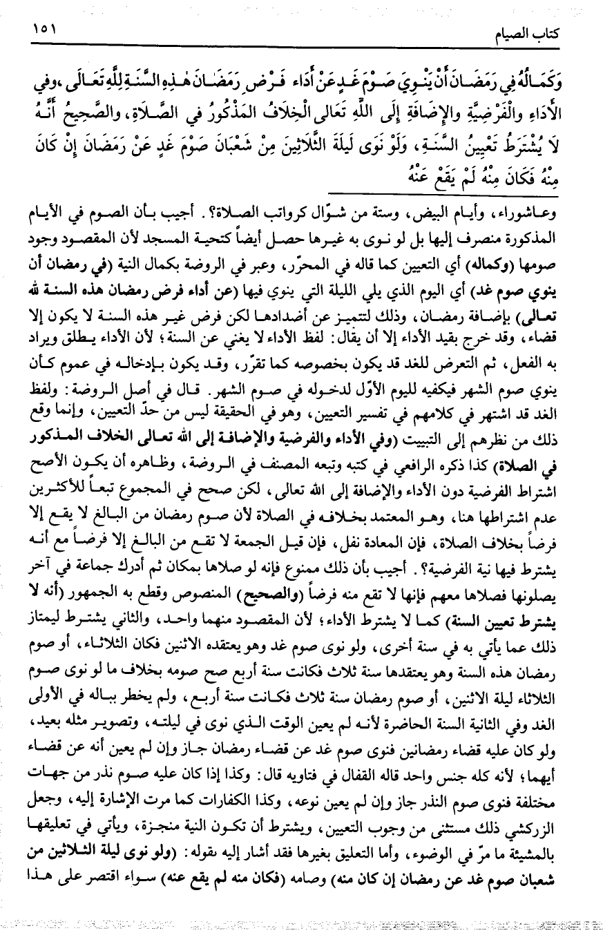 وَكَمَالُهُ فِي رَمَضَانَ أَنْ يَنْوِيَ صَوْمَ غَدٍ عَنْ أَدَاءِ فَرْضِ رَمَضَانَ هَذِهِ السَّنَةِ لِلَّهِ تَعَالَى، وَفِي الْأَدَاءِ وَالْفَرْضِيَّةِ وَالْإِضَافَةِ إلَى اللَّهِ تَعَالَى الْخِلَافُ الْمَذْكُورِ فِي الصَّلَاةِ، وَالصَّحِيحُ أَنَّهُ لَا يُشْتَرَطُ تَعْيِينُ السَّنَةِ.