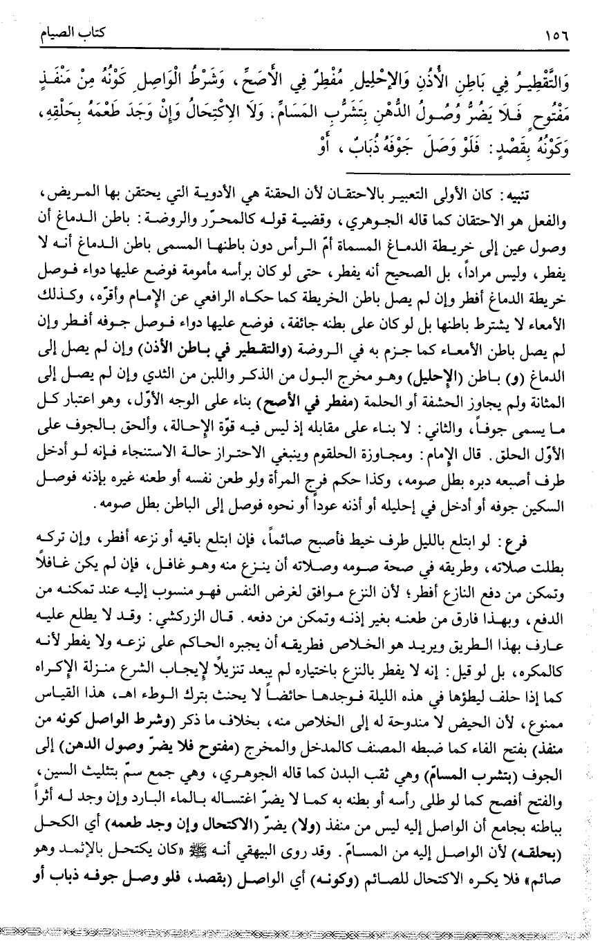 ـــــــــــــــــــــــــــــQتَنْبِيهٌ كَانَ الْأَوْلَى التَّعْبِيرَ بِالِاحْتِقَانِ؛ لِأَنَّ الْحُقْنَةَ هِيَ الْأَدْوِيَةُ الَّتِي يَحْتَقِنُ بِهَا الْمَرِيضُ، وَالْفِعْلُ هُوَ الِاحْتِقَانُ كَمَا قَالَهُ الْجَوْهَرِيُّ، وَقَضِيَّةُ قَوْلِهِ كَالْمُحَرَّرِ وَالرَّوْضَةِ: بَاطِنُ الدِّمَاغِ أَنَّ وُصُولَ عَيْنٍ إلَى خَرِيطَةِ الدِّمَاغِ الْمُسَمَّاةِ أُمَّ الرَّأْسِ دُونَ بَاطِنِهَا الْمُسَمَّى بَاطِنَ الدِّمَاغِ أَنَّهُ لَا يُفْطِرُ، وَلَيْسَ مُرَادًا، بَلْ الصَّحِيحُ أَنَّهُ يُفْطِرُ، حَتَّى لَوْ كَانَ بِرَأْسِهِ مَأْمُومَةٌ فَوَضَعَ عَلَيْهَا دَوَاءً فَوَصَلَ خَرِيطَةَ الدِّمَاغِ أَفْطَرَ وَإِنْ لَمْ يَصِلْ بَاطِنَ الْخَرِيطَةِ كَمَا حَكَاهُ الرَّافِعِيُّ عَنْ الْإِمَامِ وَأَقَرَّهُ، وَكَذَلِكَ الْأَمْعَاءُ لَا يُشْتَرَطُ بَاطِنُهَا بَلْ لَوْ كَانَ عَلَى بَطْنِهِ جَائِفَةٌ، فَوَضَعَ عَلَيْهَا دَوَاءً فَوَصَلَ جَوْفَهُ أَفْطَرَ وَإِنْ لَمْ يَصِلْ بَاطِنَ الْأَمْعَاءِ كَمَا جَزَمَ بِهِ فِي الرَّوْضَةِ.