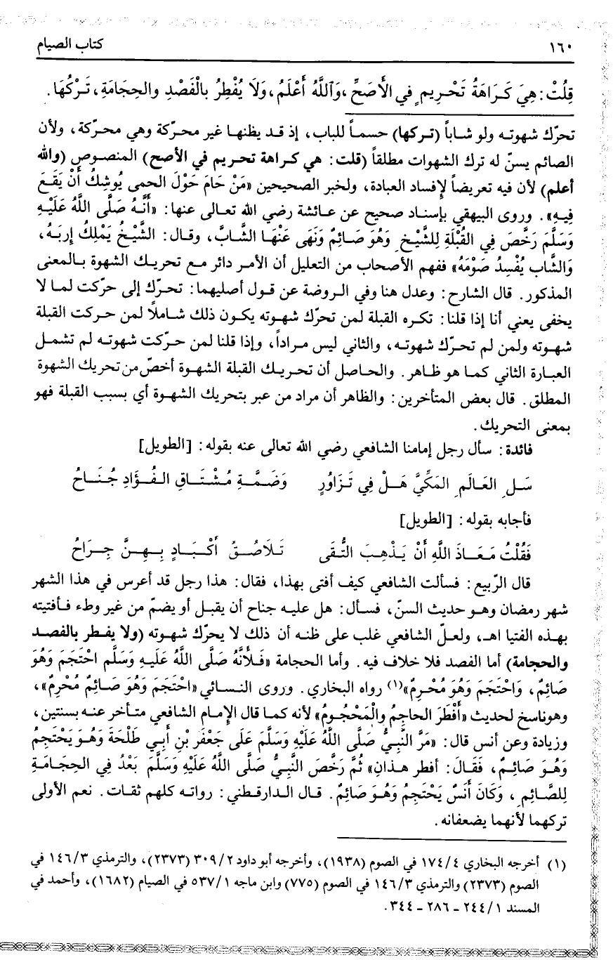 ـــــــــــــــــــــــــــــQتُحَرِّكْ شَهْوَتَهُ وَلَوْ شَابًّا (تَرْكُهَا) حَسْمًا لِلْبَابِ، إذْ قَدْ يَظُنُّهَا غَيْرَ مُحَرِّكَةٍ وَهِيَ مُحَرِّكَةٌ؛ وَلِأَنَّ الصَّائِمَ يُسَنُّ لَهُ تَرْكُ الشَّهَوَاتِ مُطْلَقًا (قُلْتُ: هِيَ كَرَاهَةُ تَحْرِيمٍ فِي الْأَصَحِّ) الْمَنْصُوصِ (وَاَللَّهُ أَعْلَمُ) ؛ لِأَنَّ فِيهِ تَعْرِيضًا لِإِفْسَادِ الْعِبَادَةِ، وَلِخَبَرِ الصَّحِيحَيْنِ «مَنْ حَامَ حَوْلَ الْحِمَى يُوشِكُ أَنْ يَقَعَ فِيهِ» .