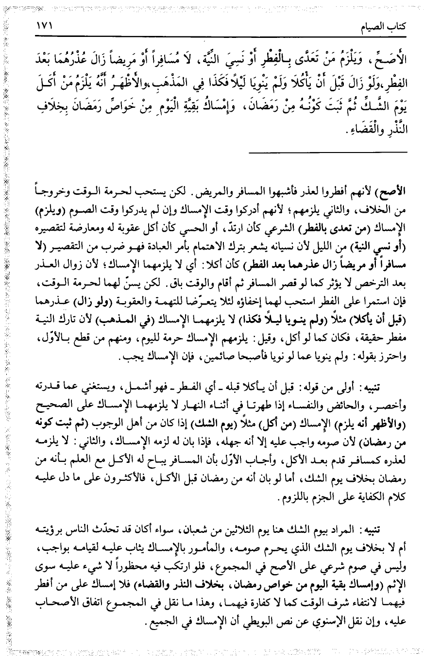 الْأَصَحِّ، وَيَلْزَمُ مَنْ تَعَدَّى بِالْفِطْرِ أَوْ نَسِيَ النِّيَّةَ، لَا مُسَافِرًا أَوْ مَرِيضًا زَالَ عُذْرُهُمَا بَعْدَ الْفِطْرِ، وَلَوْ زَالَ قَبْلَ أَنْ يَأْكُلَا وَلَمْ يَنْوِيَا لَيْلًا فَكَذَا فِي الْمَذْهَبِ، وَالْأَظْهَرُ أَنَّهُ يَلْزَمُ مَنْ أَكَلَ يَوْمَ الشَّكِّ ثُمَّ ثَبَتَ كَوْنُهُ مِنْ رَمَضَانَ، وَإِمْسَاكُ بَقِيَّةِ الْيَوْمِ مِنْ خَوَاصِّ رَمَضَانَ بِخِلَافِ النَّذْرِ وَالْقَضَاءِ.