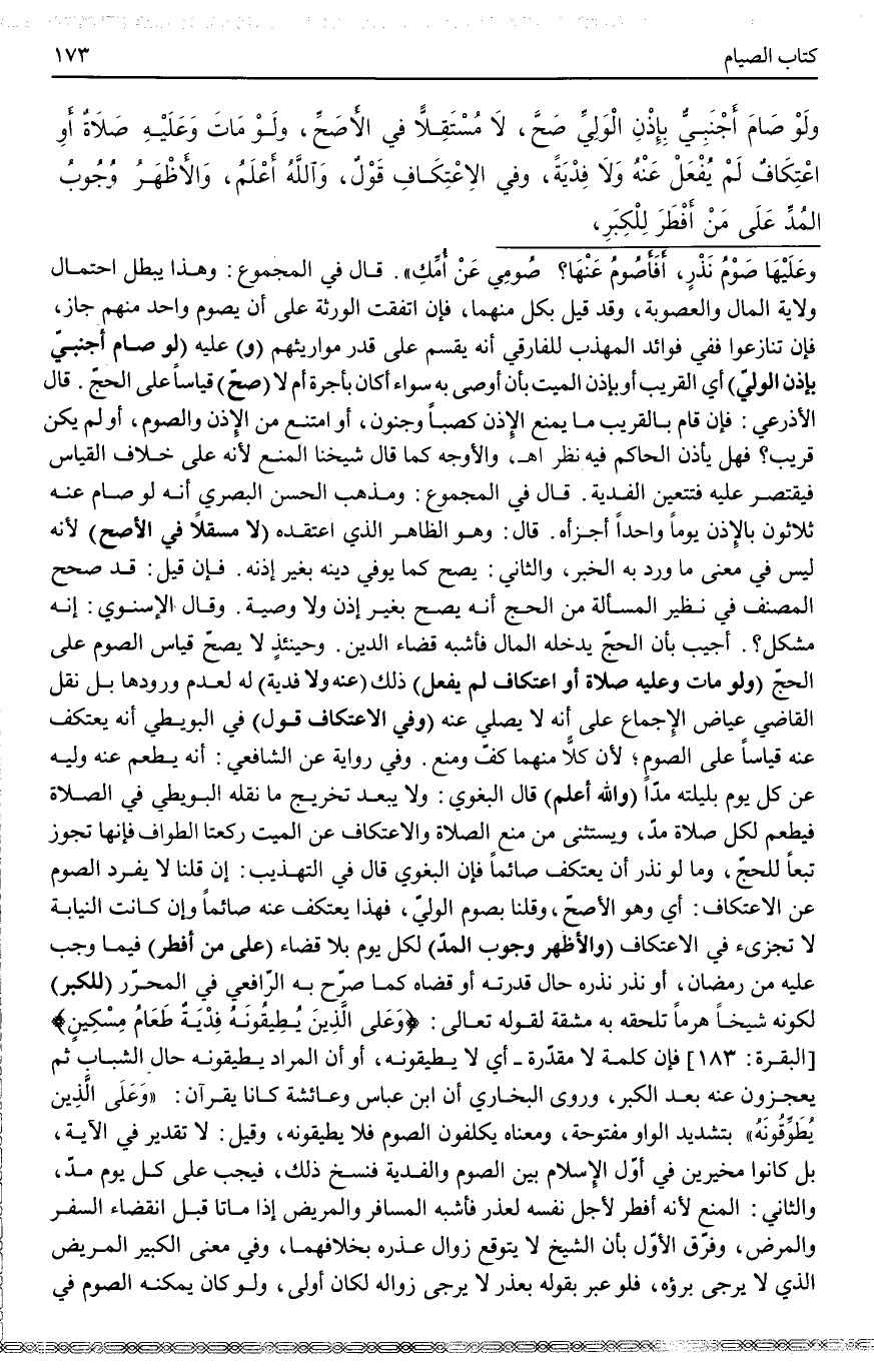 (وَ) عَلَيْهِ (لَوْ صَامَ أَجْنَبِيٌّ بِإِذْنِ الْوَلِيِّ) أَيْ الْقَرِيبِ أَوْ بِإِذْنِ الْمَيِّتِ بِأَنْ أَوْصَى بِهِ سَوَاءٌ أَكَانَ بِأُجْرَةٍ أَمْ لَا (صَحَّ) قِيَاسًا عَلَى الْحَجِّ. قَالَ الْأَذْرَعِيُّ: فَإِنْ قَامَ بِالْقَرِيبِ مَا يَمْنَعُ الْإِذْنَ كَصِبًا وَجُنُونٍ، أَوْ امْتَنَعَ مِنْ الْإِذْنِ وَالصَّوْمِ، أَوْ لَمْ يَكُنْ قَرِيبٌ فَهَلْ يَأْذَنُ الْحَاكِمُ؟ فِيهِ نَظَرٌ اهـ.