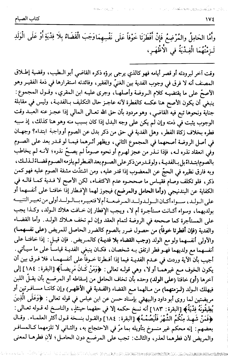أُجِيبَ بِأَنَّ الْآيَةَ وَرَدَتْ فِي عَدَمِ الْفِدْيَةِ فِيمَا إذَا أَفْطَرَتَا خَوْفًا عَلَى أَنْفُسِهِمَا، فَلَا فَرْقَ بَيْنَ أَنْ يَكُونَ الْخَوْفُ مَعَ غَيْرِهِمَا أَوْ لَا، وَهِيَ قَوْله تَعَالَى: {وَمَنْ كَانَ مَرِيضًا} [البقرة: 185] [الْبَقَرَة] إلَى آخِرِهَا (أَوْ) خَافَتَا (عَلَى الْوَلَدِ) وَحْدَهُ بِأَنْ تَخَافَ الْحَامِلُ مِنْ إسْقَاطِهِ أَوْ الْمُرْضِعُ بِأَنْ يَقِلَّ اللَّبَنُ فَيَهْلَكَ الْوَلَدُ (لَزِمَتْهُمَا) مِنْ مَالِهِمَا مَعَ الْقَضَاءِ (الْفِدْيَةُ فِي الْأَظْهَرِ) وَإِنْ كَانَتَا مُسَافِرَتَيْنِ أَوْ مَرِيضَتَيْنِ لِمَا رَوَى أَبُو دَاوُد وَالْبَيْهَقِيُّ بِإِسْنَادٍ حَسَنٍ عَنْ ابْنِ عَبَّاسٍ فِي قَوْله تَعَالَى: {وَعَلَى الَّذِينَ يُطِيقُونَهُ فِدْيَةٌ} [البقرة: 184] الْبَقَرَة أَنَّهُ نُسِخَ حُكْمُهُ إلَّا فِي حَقِّهِمَا حِينَئِذٍ، وَالنَّاسِخُ لَهُ قَوْله تَعَالَى: {فَمَنْ شَهِدَ مِنْكُمُ الشَّهْرَ فَلْيَصُمْهُ} [البقرة: 185] [الْبَقَرَة] وَالْقَوْلُ بِنَسْخِهِ قَوْلُ أَكْثَرِ الْعُلَمَاءِ. وَقَالَ بَعْضُهُمْ: إنَّهُ مُحْكَمٌ غَيْرُ مَنْسُوخٍ بِتَأْوِيلِهِ بِمَا مَرَّ فِي الِاحْتِجَاجِ بِهِ، وَالثَّانِي لَا تَلْزَمُهُمَا كَالْمُسَافِرِ وَالْمَرِيضِ لِأَنَّ فِطْرَهُمَا لِعُذْرٍ، وَالثَّالِثُ: تَجِبُ عَلَى الْمُرْضِعِ دُونَ الْحَامِلِ؛ لِأَنَّ فِطْرَهَا لِمَعْنًى
