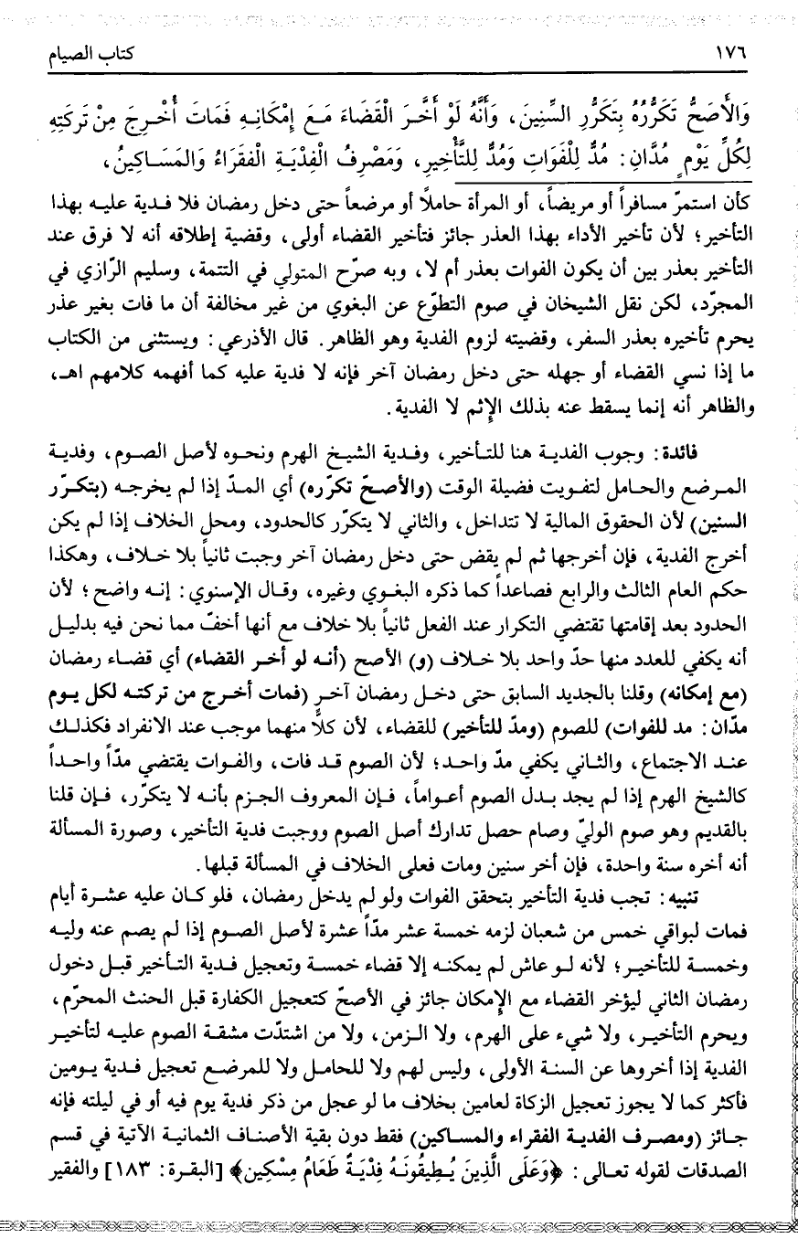 فَائِدَةٌ: وُجُوبُ الْفِدْيَةِ هُنَا لِلتَّأْخِيرِ، وَفِدْيَةُ الشَّيْخِ الْهَرِمِ وَنَحْوِهِ لِأَصْلِ الصَّوْمِ، وَفِدْيَةُ الْمُرْضِعِ وَالْحَامِلِ لِتَفْوِيتِ فَضِيلَةِ الْوَقْتِ (وَالْأَصَحُّ تَكَرُّرُهُ) أَيْ الْمُدِّ إذَا لَمْ يُخْرِجْهُ (بِتَكَرُّرِ السِّنِينَ) لِأَنَّ الْحُقُوقَ الْمَالِيَّةَ لَا تَتَدَاخَلُ، وَالثَّانِي لَا يَتَكَرَّرُ كَالْحُدُودِ، وَمَحِلُّ الْخِلَافِ إذَا لَمْ يَكُنْ أَخْرَجَ الْفِدْيَةَ، فَإِنْ أَخْرَجَهَا ثُمَّ لَمْ يَقْضِ حَتَّى دَخَلَ رَمَضَانُ آخَرُ وَجَبَتْ ثَانِيًا بِلَا خِلَافٍ، وَهَكَذَا حُكْمُ الْعَامِ الثَّالِثِ وَالرَّابِعِ فَصَاعِدًا كَمَا ذَكَرَهُ الْبَغَوِيّ وَغَيْرُهُ، وَقَالَ الْإِسْنَوِيُّ: إنَّهُ وَاضِحٌ؛ لِأَنَّ الْحُدُودَ بَعْدَ إقَامَتِهَا تَقْتَضِي التَّكْرَارَ عِنْدَ الْفِعْلِ ثَانِيًا بِلَا خِلَافٍ مَعَ أَنَّهَا أَخَفُّ مِمَّا نَحْنُ فِيهِ بِدَلِيلِ أَنَّهُ يَكْفِي لِلْعَدَدِ مِنْهَا حَدٌّ وَاحِدٌ بِلَا خِلَافٍ.