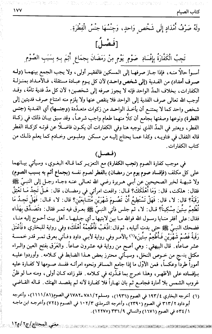 (فَصْلٌ) فِي مُوجِبِ كَفَّارَةِ الصَّوْمِ (تَجِبُ الْكَفَّارَةُ) مَعَ التَّعْزِيرِ كَمَا قَالَهُ الْبَغَوِيّ، وَسَيَأْتِي بَيَانُهُمَا عَلَى كُلِّ مُكَلَّفٍ (بِإِفْسَادِ صَوْمِ يَوْمٍ مِنْ رَمَضَانَ) بِالْفِطْرِ لِصَوْمِ نَفْسِهِ (بِجِمَاعٍ أَثِمَ بِهِ بِسَبَبِ الصَّوْمِ) وَلَا شُبْهَةَ لِخَبَرِ الصَّحِيحَيْنِ عَنْ أَبِي هُرَيْرَةَ - رَضِيَ اللَّهُ تَعَالَى عَنْهُ - «جَاءَ رَجُلٌ إلَى النَّبِيِّ - صَلَّى اللَّهُ عَلَيْهِ وَسَلَّمَ - فَقَالَ: هَلَكْتُ، قَالَ: وَمَا أَهْلَكَكَ؟ قَالَ: وَاقَعْتُ امْرَأَتِي فِي رَمَضَانَ، قَالَ: هَلْ تَجِدُ مَا تَعْتِقُ رَقَبَةً؟ قَالَ: لَا، قَالَ: فَهَلْ تَسْتَطِيعُ أَنْ تَصُومَ شَهْرَيْنِ مُتَتَابِعَيْنِ؟ قَالَ: لَا، قَالَ: فَهَلْ تَجِدُ مَا تُطْعِمُ سِتِّينَ مِسْكِينًا؟ قَالَ: لَا، ثُمَّ جَلَسَ فَأُتِيَ النَّبِيُّ - صَلَّى اللَّهُ عَلَيْهِ وَسَلَّمَ - بِعَرَقٍ فِيهِ تَمْرٌ فَقَالَ: تَصَدَّقْ بِهَذَا فَقَالَ: عَلَى أَفْقَرَ مِنَّا يَا رَسُولَ اللَّهِ فَوَاَللَّهِ مَا بَيْنَ لَابَتَيْهَا - أَيْ جَبَلَيْهَا - أَهْلُ بَيْتٍ أَحْوَجُ إلَيْهِ مِنَّا، فَضَحِكَ النَّبِيُّ - صَلَّى اللَّهُ عَلَيْهِ وَسَلَّمَ - حَتَّى بَدَتْ أَنْيَابُهُ، ثُمَّ قَالَ: اذْهَبْ فَأَطْعِمْهُ أَهْلَكَ» وَفِي رِوَايَةِ الْبُخَارِيِّ «فَأَعْتِقْ رَقَبَةً فَصُمْ شَهْرَيْنِ فَأَطْعِمْ سِتِّينَ» بِالْأَمْرِ وَفِي رِوَايَةٍ لِأَبِي دَاوُد «فَأُتِيَ بِعَرَقِ تَمْرٍ قَدْرُ خَمْسَةَ عَشَرَ صَاعًا» . قَالَ الْبَيْهَقِيُّ: وَهِيَ أَصَحُّ مِنْ رِوَايَةِ فِيهِ عِشْرُونَ صَاعًا.