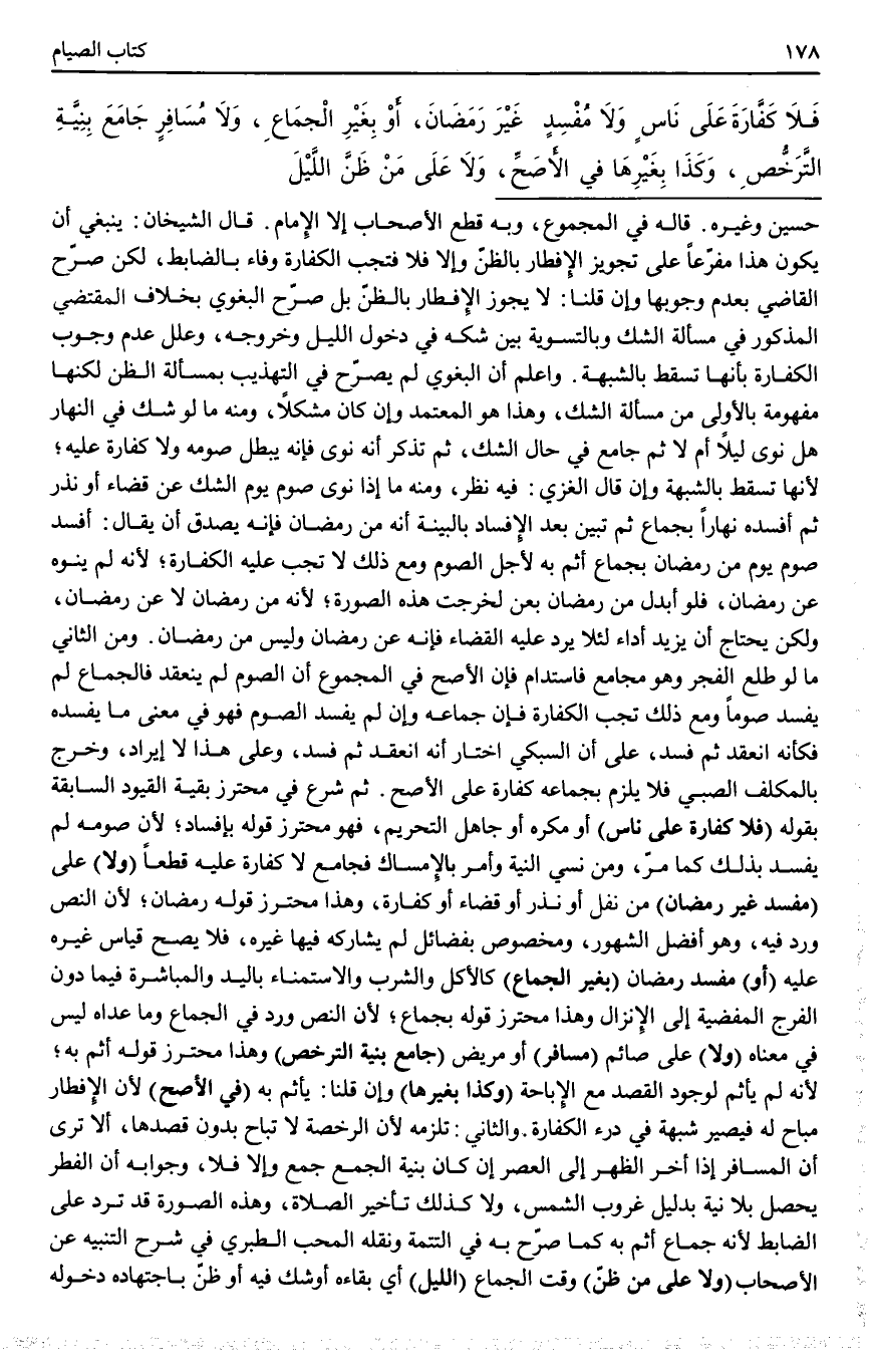 قَالَ الشَّيْخَانِ: يَنْبَغِي أَنْ يَكُونَ هَذَا مُفَرَّعًا عَلَى تَجْوِيزِ الْإِفْطَارِ بِالظَّنِّ وَإِلَّا فَلَا فَتَجِبُ الْكَفَّارَةُ وَفَاءً بِالضَّابِطِ، لَكِنْ صَرَّحَ الْقَاضِي بِعَدَمِ وُجُوبِهَا وَإِنْ قُلْنَا: لَا يَجُوزُ الْإِفْطَارُ بِالظَّنِّ بَلْ صَرَّحَ الْبَغَوِيّ بِخِلَافِ الْمُقْتَضِي الْمَذْكُورِ فِي مَسْأَلَةِ الشَّكِّ وَبِالتَّسْوِيَةِ بَيْنَ شَكِّهِ فِي دُخُولِ اللَّيْلِ وَخُرُوجِهِ، وَعُلِّلَ عَدَمُ وُجُوبِ الْكَفَّارَةِ بِأَنَّهَا تَسْقُطُ بِالشُّبْهَةِ.