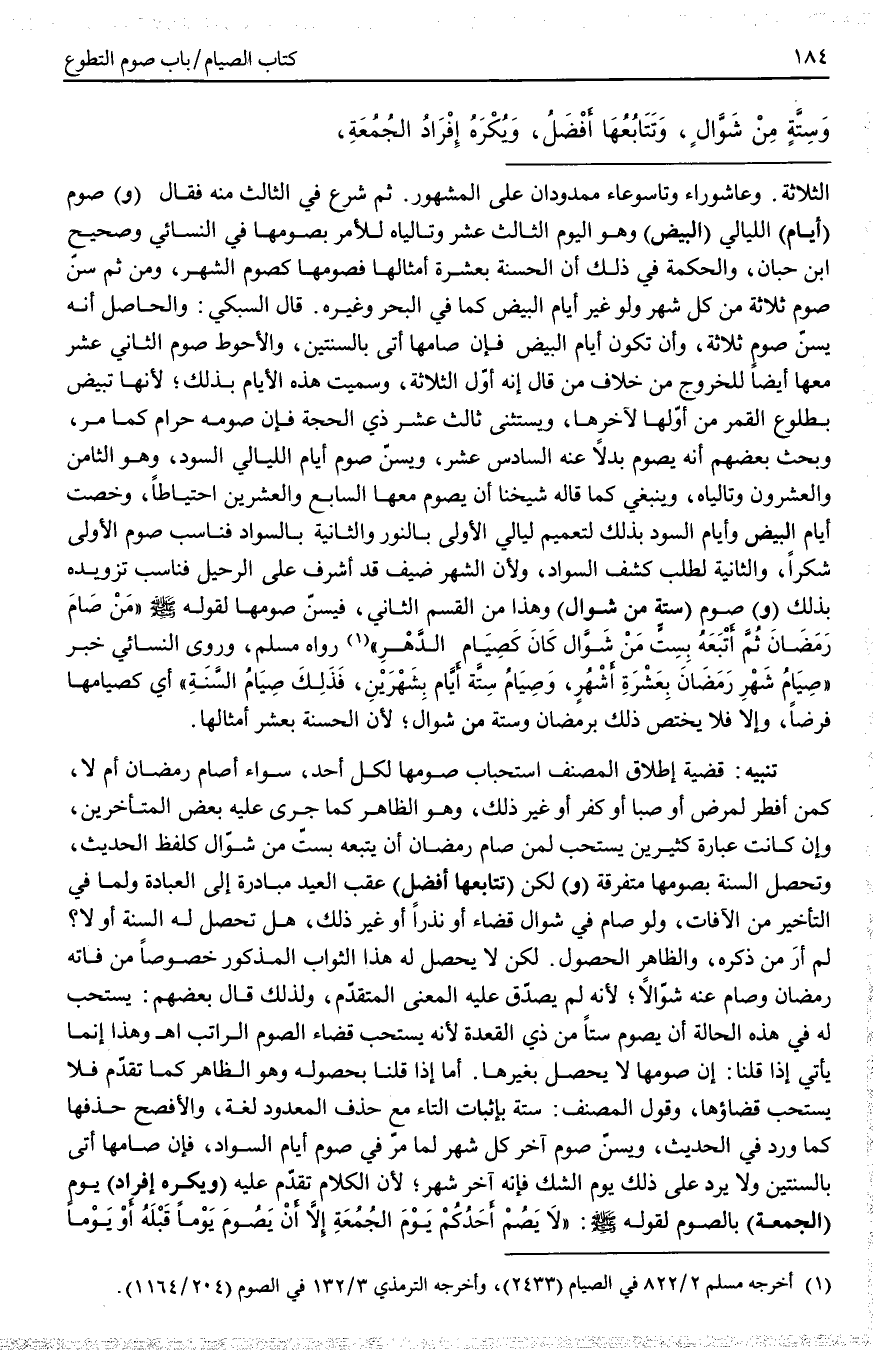 وَهَذَا إنَّمَا يَأْتِي إذَا قُلْنَا: إنَّ صَوْمَهَا لَا يَحْصُلُ بِغَيْرِهَا. أَمَّا إذَا قُلْنَا بِحُصُولِهِ وَهُوَ الظَّاهِرُ كَمَا تَقَدَّمَ فَلَا يُسْتَحَبُّ قَضَاؤُهَا، وَقَوْلُ الْمُصَنِّفُ: سِتَّةٌ بِإِثْبَاتِ التَّاءِ مَعَ حَذْفِ الْمَعْدُودِ لُغَةً، وَالْأَفْصَحُ حَذْفُهَا كَمَا وَرَدَ فِي الْحَدِيثِ، وَيُسَنُّ صَوْمُ آخِرِ كُلِّ شَهْرٍ لِمَا مَرَّ فِي صَوْمِ أَيَّامِ السَّوَادِ، فَإِنْ صَامَهَا أَتَى بِالسَّنَتَيْنِ وَلَا يَرِدُ عَلَى ذَلِكَ يَوْمُ الشَّكِّ فَإِنَّهُ آخِرُ شَهْرٍ؛ لِأَنَّ الْكَلَامَ تَقَدَّمَ عَلَيْهِ.