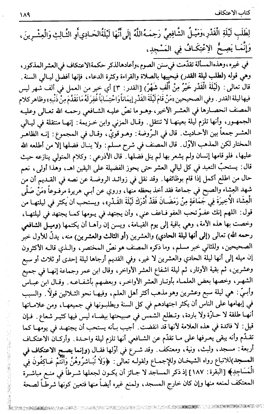 ـــــــــــــــــــــــــــــQفِي غَيْرِهِ، وَهَذِهِ الْمَسْأَلَةُ تَقَدَّمَتْ فِي سُنَنِ الصَّوْمِ، وَأَعَادَهَا لِذِكْرِ حِكْمَةِ الِاعْتِكَافِ فِي الْعَشْرِ الْمَذْكُورِ، وَهِيَ قَوْلُهُ (لِطَلَبِ لَيْلَةِ الْقَدْرِ) . بِالصَّلَاةِ وَالْقِرَاءَةِ وَكَثْرَةِ الدُّعَاءِ، فَإِنَّهَا أَفْضَلُ لَيَالِي السَّنَةِ. قَالَ تَعَالَى: {لَيْلَةُ الْقَدْرِ خَيْرٌ مِنْ أَلْفِ شَهْرٍ} [القدر: 3] أَيْ خَيْرٌ مِنْ الْعَمَلِ فِي أَلْفِ شَهْرٍ لَيْسَ فِيهَا لَيْلَةُ الْقَدْرِ. وَفِي الصَّحِيحَيْنِ «مَنْ قَامَ لَيْلَةَ الْقَدْرِ إيمَانًا وَاحْتِسَابًا غُفِرَ لَهُ مَا تَقَدَّمَ مِنْ ذَنْبِهِ» وَظَاهِرُ كَلَامِ الْمُصَنِّفِ انْحِصَارُهَا فِي الْعَشْرِ الْأَخِيرَةِ، وَهُوَ مَا نَصَّ عَلَيْهِ الشَّافِعِيُّ رَحِمَهُ اللَّهُ تَعَالَى وَعَلَيْهِ الْجُمْهُورُ، وَأَنَّهَا تَلْزَمُ لَيْلَةً بِعَيْنِهَا لَا تَنْتَقِلُ. وَقَالَ الْمُزَنِيّ وَابْنُ خُزَيْمَةَ: إنَّهَا مُنْتَقِلَةٌ فِي لَيَالِي الْعَشْرِ جَمْعًا بَيْنَ الْأَحَادِيثِ. قَالَ فِي الرَّوْضَةِ: وَهُوَ قَوِيٌّ، وَقَالَ فِي الْمَجْمُوعِ: إنَّهُ الظَّاهِرُ الْمُخْتَارُ لَكِنَّ الْمَذْهَبَ الْأَوَّلُ. قَالَ الْمُصَنِّفُ فِي شَرْحِ مُسْلِمٍ: وَلَا يَنَالُ فَضْلَهَا إلَّا مَنْ أَطْلَعَهُ اللَّهُ عَلَيْهَا، فَلَوْ قَامَهَا إنْسَانٌ وَلَمْ يَشْعُرْ بِهَا لَمْ يَنَلْ فَضْلَهَا.