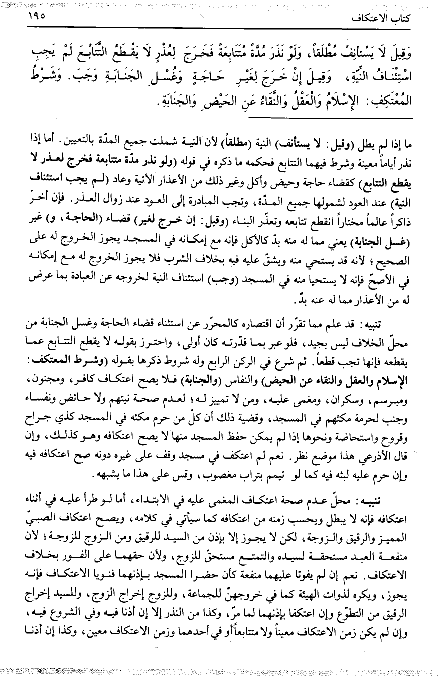 ثُمَّ شَرَعَ فِي الرُّكْنِ الرَّابِعِ وَلَهُ شُرُوطٌ ذَكَرَهَا بِقَوْلِهِ (وَشَرْطُ الْمُعْتَكِفِ: الْإِسْلَامُ وَالْعَقْلُ وَالنَّقَاءُ عَنْ الْحَيْضِ) وَالنِّفَاسِ (وَالْجَنَابَةِ) فَلَا يَصِحُّ اعْتِكَافُ كَافِرٍ، وَمَجْنُونٍ، وَمُبَرْسَمٍ، وَسَكْرَانَ، وَمُغْمًى عَلَيْهِ، وَمَنْ لَا تَمْيِيزَ لَهُ؛ لِعَدَمِ صِحَّةِ نِيَّتِهِمْ وَلَا حَائِضٍ وَنُفَسَاءَ وَجُنُبٍ لِحُرْمَةِ مُكْثِهِمْ فِي الْمَسْجِدِ، وَقَضِيَّةُ ذَلِكَ أَنَّ كُلَّ مَنْ حَرُمَ مُكْثُهُ فِي الْمَسْجِدِ كَذِي جِرَاحٍ وَقُرُوحٍ وَاسْتِحَاضَةٍ وَنَحْوِهَا إذَا لَمْ يُمْكِنْ حِفْظُ الْمَسْجِدِ مِنْهَا لَا يَصِحُّ اعْتِكَافُهُ وَهُوَ كَذَلِكَ، وَإِنْ قَالَ الْأَذْرَعِيُّ هَذَا مَوْضِعُ نَظَرٍ. نَعَمْ لَوْ اعْتَكَفَ فِي مَسْجِدٍ وُقِفَ عَلَى غَيْرِهِ دُونَهُ صَحَّ اعْتِكَافُهُ فِيهِ وَإِنْ حَرُمَ عَلَيْهِ لُبْثُهُ فِيهِ كَمَا لَوْ تَيَمَّمَ بِتُرَابٍ مَغْصُوبٍ، وَقِسْ عَلَى هَذَا مَا يُشْبِهُهُ.