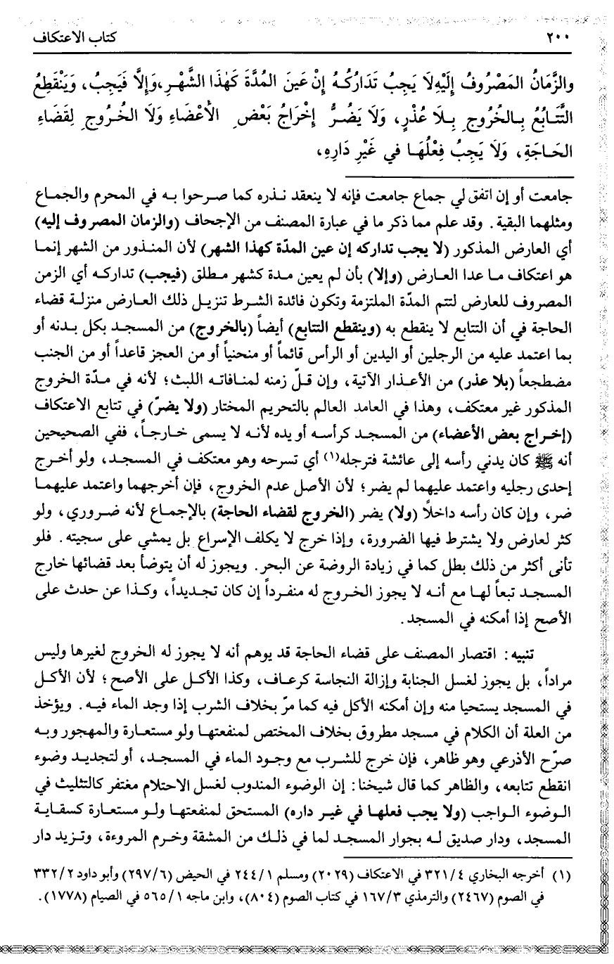 ـــــــــــــــــــــــــــــQجَامَعْت أَوْ إنْ اتَّفَقَ لِي جِمَاعٌ جَامَعْت فَإِنَّهُ لَا يَنْعَقِدُ نَذْرُهُ كَمَا صَرَّحُوا بِهِ فِي الْمُحْرِمِ وَالْجِمَاعِ وَمِثْلُهُمَا الْبَقِيَّةُ. وَقَدْ عُلِمَ مِمَّا ذُكِرَ مَا فِي عِبَارَةِ الْمُصَنِّفِ مِنْ الْإِجْحَافِ (وَالزَّمَانُ الْمَصْرُوفُ إلَيْهِ) أَيْ الْعَارِضُ الْمَذْكُورُ (لَا يَجِبُ تَدَارُكُهُ إنْ عَيَّنَ الْمُدَّةَ كَهَذَا الشَّهْرِ) لِأَنَّ الْمَنْذُورَ مِنْ الشَّهْرِ إنَّمَا هُوَ اعْتِكَافُ مَا عَدَا الْعَارِضَ (وَإِلَّا) بِأَنْ لَمْ يُعَيِّنْ مُدَّةً كَشَهْرٍ مُطْلَقٍ (فَيَجِبُ) تَدَارُكُهُ أَيْ الزَّمَنِ الْمَصْرُوفِ لِلْعَارِضِ لِتَتِمَّ الْمُدَّةُ الْمُلْتَزَمَةُ، وَتَكُونُ فَائِدَةُ الشَّرْطِ تَنْزِيلَ ذَلِكَ الْعَارِضِ مَنْزِلَةَ قَضَاءِ الْحَاجَةِ فِي أَنَّ التَّتَابُعَ لَا يَنْقَطِعُ بِهِ (وَيَنْقَطِعُ التَّتَابُعُ) أَيْضًا (بِالْخُرُوجِ) مِنْ الْمَسْجِدِ بِكُلِّ بَدَنِهِ أَوْ بِمَا اعْتَمَدَ عَلَيْهِ مِنْ الرِّجْلَيْنِ أَوْ الْيَدَيْنِ أَوْ الرَّأْسِ قَائِمًا أَوْ مُنْحَنِيًا أَوْ مِنْ الْعَجُزِ قَاعِدًا أَوْ مِنْ الْجَنْبِ مُضْطَجِعًا (بِلَا عُذْرٍ) مِنْ الْأَعْذَارِ الْآتِيَةِ، وَإِنْ قَلَّ زَمَنُهُ لِمُنَافَاتِهِ اللُّبْثَ؛ لِأَنَّهُ فِي مُدَّةِ الْخُرُوجِ الْمَذْكُورِ غَيْرُ مُعْتَكِفٍ، وَهَذَا فِي الْعَامِدِ الْعَالِمِ بِالتَّحْرِيمِ الْمُخْتَارِ.