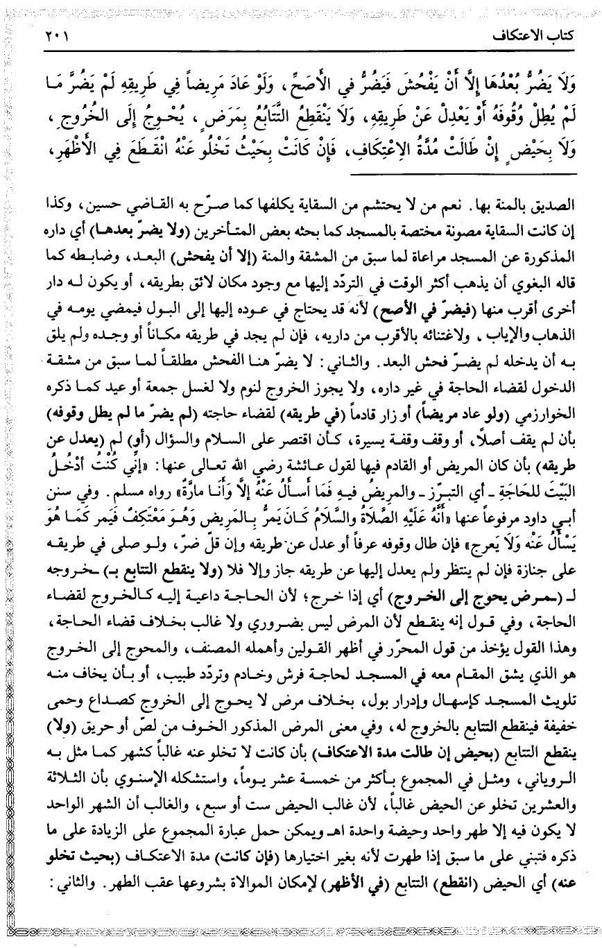 وَفِي سُنَنِ أَبِي دَاوُد مَرْفُوعًا عَنْهَا «أَنَّهُ - عَلَيْهِ الصَّلَاةُ وَالسَّلَامُ - كَانَ يَمُرُّ بِالْمَرِيضِ وَهُوَ مُعْتَكِفٌ فَيَمُرُّ كَمَا هُوَ يَسْأَلُ عَنْهُ وَلَا يُعَرِّجُ» فَإِنْ طَالَ وُقُوفُهُ عُرْفًا أَوْ عَدَلَ عَنْ طَرِيقِهِ وَإِنْ قَلَّ ضَرَّ، وَلَوْ صَلَّى فِي طَرِيقِهِ عَلَى جِنَازَةٍ فَإِنْ لَمْ يَنْتَظِرْ وَلَمْ يَعْدِلْ إلَيْهَا عَنْ طَرِيقِهِ جَازَ وَإِلَّا فَلَا (وَلَا يَنْقَطِعُ التَّتَابُعُ ب) خُرُوجِهِ ل (مَرَضٍ يُحْوِجُ إلَى الْخُرُوجِ) أَيْ إذَا خَرَجَ؛ لِأَنَّ الْحَاجَةَ دَاعِيَةٌ إلَيْهِ كَالْخُرُوجِ لِقَضَاءِ الْحَاجَةِ، وَفِي قَوْلٍ إنَّهُ يَنْقَطِعُ لِأَنَّ الْمَرَضَ لَيْسَ بِضَرُورِيٍّ وَلَا غَالِبٍ بِخِلَافِ قَضَاءِ الْحَاجَةِ، وَهَذَا الْقَوْلُ يُؤْخَذُ مِنْ قَوْلِ الْمُحَرَّرِ فِي أَظْهَرِ الْقَوْلَيْنِ وَأَهْمَلَهُ الْمُصَنِّفُ، وَالْمُحْوِجُ إلَى الْخُرُوجِ هُوَ الَّذِي يَشُقُّ الْمُقَامُ مَعَهُ فِي الْمَسْجِدِ لِحَاجَةِ فَرْشٍ وَخَادِمٍ وَتَرَدُّدِ طَبِيبٍ، أَوْ بِأَنْ يُخَافَ مِنْهُ تَلْوِيثُ الْمَسْجِدِ كَإِسْهَالٍ وَإِدْرَارِ بَوْلٍ، بِخِلَافِ مَرَضٍ لَا يُحْوِجُ إلَى الْخُرُوجِ كَصُدَاعٍ وَحُمَّى خَفِيفَةٍ فَيَنْقَطِعُ التَّتَابُعُ بِالْخُرُوجِ لَهُ، وَفِي مَعْنَى الْمَرَضِ الْمَذْكُورِ الْخَوْفُ مِنْ لِصٍّ أَوْ حَرِيقٍ.