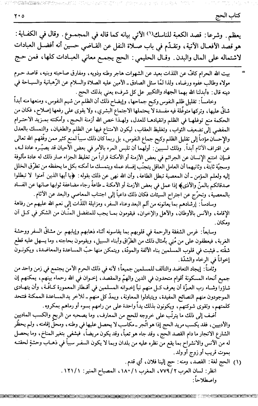 ـــــــــــــــــــــــــــــQيُعَظَّمُ. وَشَرْعًا: قَصْدُ الْكَعْبَةِ لِلنَّاسِكِ الْآتِي بَيَانُهُ كَمَا قَالَهُ فِي الْمَجْمُوعِ. وَقَالَ فِي الْكِفَايَةِ: هُوَ قَصْدُ الْأَفْعَالِ الْآتِيَةِ، وَتَقَدَّمَ فِي بَابِ صَلَاةِ النَّفْلِ عَنْ الْقَاضِي حُسَيْنٍ أَنَّهُ أَفْضَلُ الْعِبَادَاتِ لِاشْتِمَالِهِ عَلَى الْمَالِ وَالْبَدَنِ. وَقَالَ الْحَلِيمِيُّ: الْحَجُّ يَجْمَعُ مَعَانِيَ الْعِبَادَاتِ كُلِّهَا، فَمَنْ حَجَّ