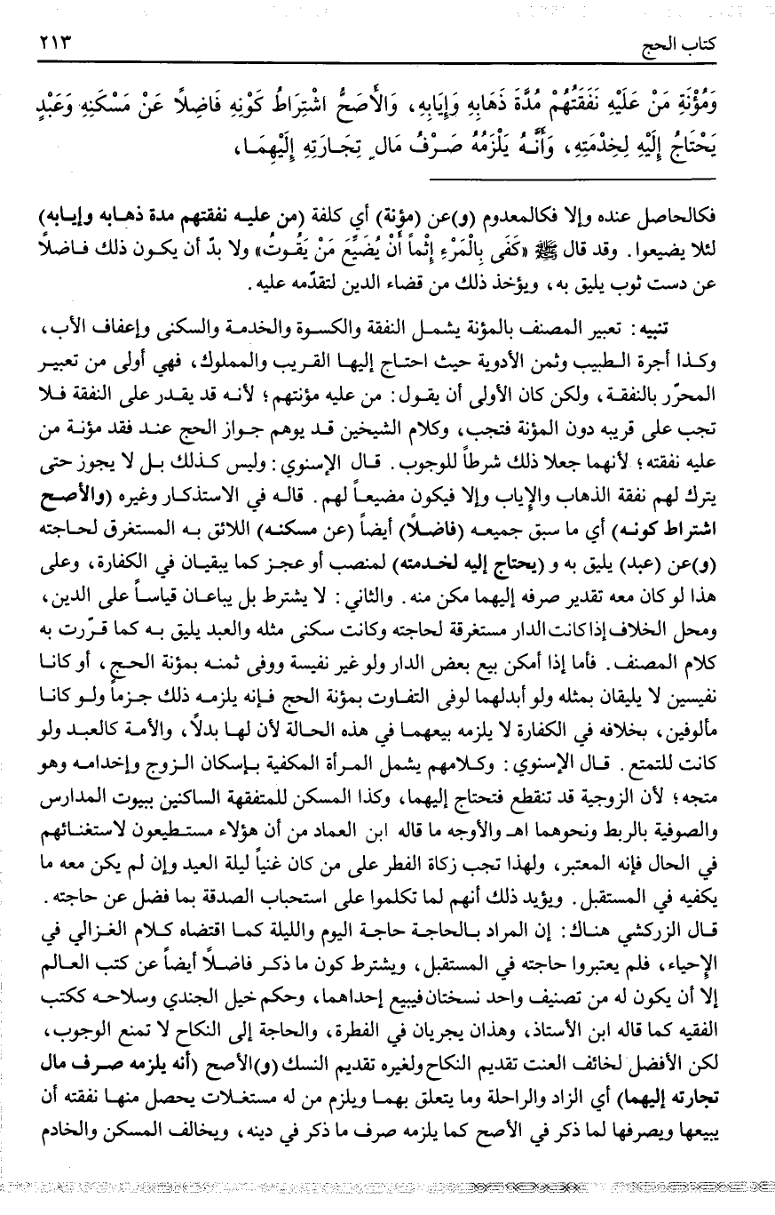 قَالَ الْإِسْنَوِيُّ: وَلَيْسَ كَذَلِكَ بَلْ لَا يَجُوزُ حَتَّى يَتْرُكَ لَهُمْ نَفَقَةَ الذَّهَابِ وَالْإِيَابِ وَإِلَّا فَيَكُونُ مُضَيِّعًا لَهُمْ. قَالَهُ فِي الِاسْتِذْكَارِ وَغَيْرِهِ (وَالْأَصَحُّ اشْتِرَاطُ كَوْنِهِ) أَيْ مَا سَبَقَ جَمِيعِهِ (فَاضِلًا) أَيْضًا (عَنْ مَسْكَنِهِ) اللَّائِقِ بِهِ الْمُسْتَغْرِقِ لِحَاجَتِهِ (وَ) عَنْ (عَبْدٍ) يَلِيقُ بِهِ وَ (يَحْتَاجُ إلَيْهِ لِخِدْمَتِهِ) لِمَنْصِبٍ أَوْ عَجْزٍ كَمَا يُبْقَيَانِ فِي الْكَفَّارَةِ، وَعَلَى هَذَا لَوْ كَانَ مَعَهُ تَقْدِيرٌ صَرَفَهُ إلَيْهِمَا مُكِّنَ مِنْهُ. وَالثَّانِي: لَا يُشْتَرَطُ بَلْ يُبَاعَانِ قِيَاسًا عَلَى الدَّيْنِ، وَمَحَلُّ الْخِلَافِ إذَا كَانَتْ الدَّارُ مُسْتَغْرِقَةً لِحَاجَتِهِ وَكَانَتْ سُكْنَى مِثْلِهِ وَالْعَبْدُ يَلِيقُ بِهِ كَمَا قَرَّرْت بِهِ كَلَامَ الْمُصَنِّفِ. فَأَمَّا إذَا أَمْكَنَ بَيْعُ بَعْضِ الدَّارِ وَلَوْ غَيْرَ نَفِيسَةٍ وَوَفَى ثَمَنُهُ بِمُؤْنَةِ الْحَجِّ، أَوْ كَانَا نَفِيسَيْنِ لَا يَلِيقَانِ بِمِثْلِهِ وَلَوْ أَبْدَلَهُمَا لَوَفَى التَّفَاوُتُ بِمُؤْنَةِ الْحَجِّ فَإِنَّهُ يَلْزَمُهُ ذَلِكَ جَزْمًا وَلَوْ كَانَا مَأْلُوفَيْنِ، بِخِلَافِهِ فِي الْكَفَّارَةِ لَا يَلْزَمُهُ بَيْعُهُمَا فِي هَذِهِ الْحَالَةِ لِأَنَّ لَهَا بَدَلًا، وَالْأَمَةُ كَالْعَبْدِ وَلَوْ كَانَتْ لِلتَّمَتُّعِ.