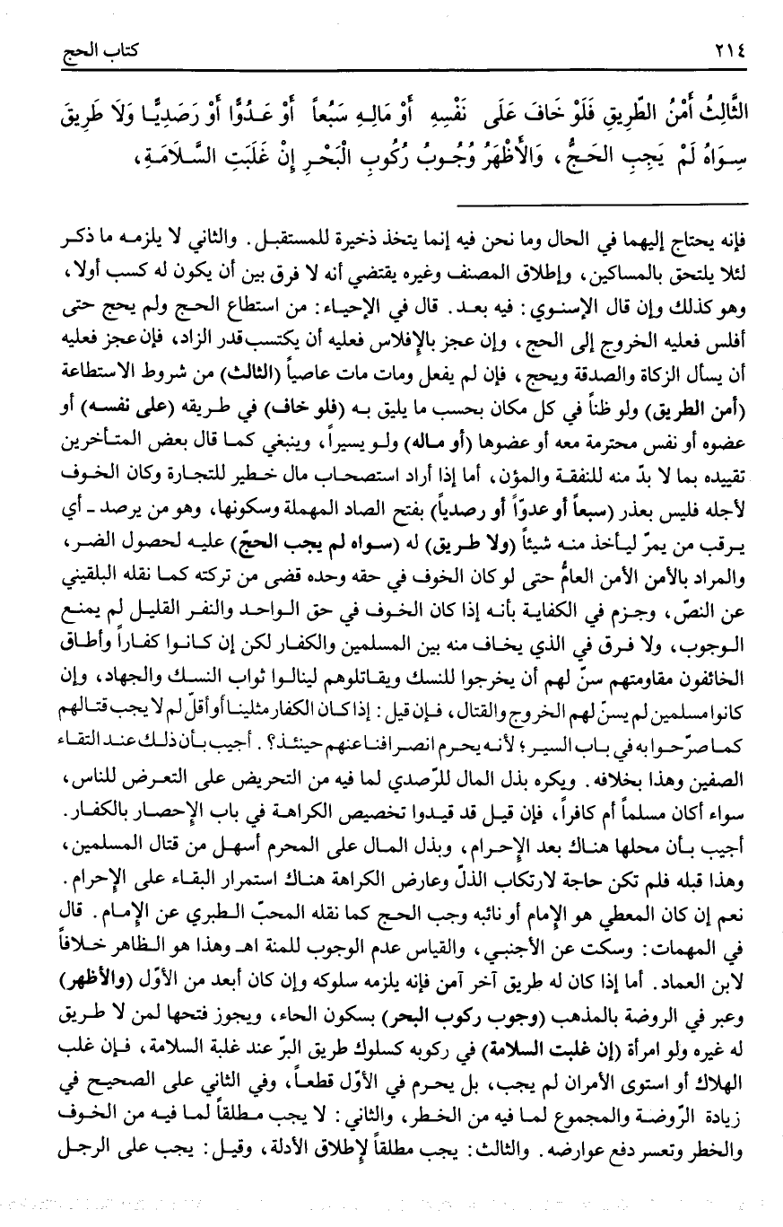 تَنْبِيهٌ وَيُشْتَرَطُ فِي وُجُوبِ النُّسُكِ وُجُودُ الْمَاءِ وَالزَّادِ فِي الْمَوَاضِعِ الْمُعْتَادِ حَمْلُهُ مِنْهَا بِثَمَنِ الْمِثْلِ (الثَّالِثُ) مِنْ شُرُوطِ الِاسْتِطَاعَةِ (أَمْنُ الطَّرِيقِ) وَلَوْ ظَنًّا فِي كُلِّ مَكَان بِحَسَبِ مَا يَلِيقُ بِهِ (فَلَوْ خَافَ) فِي طَرِيقِهِ (عَلَى نَفْسِهِ) أَوْ عُضْوِهِ أَوْ نَفْسٍ مُحْتَرَمَةٍ مَعَهُ أَوْ عُضْوِهَا (أَوْ مَالِهِ) وَلَوْ يَسِيرًا، وَيَنْبَغِي كَمَا قَالَ بَعْضُ الْمُتَأَخِّرِينَ تَقْيِيدُهُ بِمَا لَا بُدَّ مِنْهُ لِلنَّفَقَةِ وَالْمُؤَنِ، أَمَّا إذَا أَرَادَ اسْتِصْحَابَ مَالٍ خَطِيرٍ لِلتِّجَارَةِ وَكَانَ الْخَوْفُ لِأَجْلِهِ فَلَيْسَ بِعُذْرٍ (سَبُعًا أَوْ عَدُوًّا أَوْ رَصَدِيًّا) بِفَتْحِ الصَّادِ الْمُهْمَلَةِ وَسُكُونِهَا، وَهُوَ مَنْ يَرْصُدُ - أَيْ يَرْقُبُ مَنْ يَمُرُّ لِيَأْخُذَ مِنْهُ شَيْئًا (وَلَا طَرِيقَ) لَهُ (سِوَاهُ لَمْ يَجِبْ الْحَجُّ) عَلَيْهِ لِحُصُولِ الضُّرِّ، وَالْمُرَادُ بِالْأَمْنِ الْأَمْنُ الْعَامُّ حَتَّى لَوْ كَانَ الْخَوْفُ فِي حَقِّهِ وَحْدَهُ قُضِيَ مِنْ تَرِكَتِهِ كَمَا نَقَلَهُ الْبُلْقِينِيُّ عَنْ النَّصِّ، وَجَزَمَ فِي الْكِفَايَةِ بِأَنَّهُ إذَا كَانَ الْخَوْفُ فِي حَقِّ الْوَاحِدِ وَالنَّفْرِ الْقَلِيلِ لَمْ يُمْنَعْ الْوُجُوبُ، وَلَا فَرْقَ فِي الَّذِي يُخَافُ مِنْهُ بَيْنَ الْمُسْلِمِينَ وَالْكُفَّارِ لَكِنْ إنْ كَانُوا كُفَّارًا وَأَطَاقَ الْخَائِفُونَ مُقَاوَمَتَهُمْ سُنَّ لَهُمْ أَنْ يَخْرُجُوا لِلنُّسُكِ وَيُقَاتِلُوهُمْ لِيَنَالُوا ثَوَابَ النُّسُكِ وَالْجِهَادِ، وَإِنْ كَانُوا مُسْلِمِينَ لَمْ يُسَنَّ لَهُمْ الْخُرُوجُ وَالْقِتَالُ.