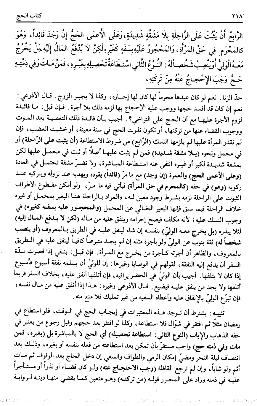 الرَّابِعُ أَنْ يَثْبُتَ عَلَى الرَّاحِلَةِ بِلَا مَشَقَّةٍ شَدِيدَةٍ وَعَلَى الْأَعْمَى الْحَجُّ إنْ وَجَدَ قَائِدًا، وَهُوَ كَالْمَحْرَمِ فِي حَقِّ الْمَرْأَةِ، وَالْمَحْجُورُ عَلَيْهِ بِسَفَهٍ كَغَيْرِهِ لَكِنْ لَا يُدْفَعُ الْمَالُ إلَيْهِ، بَلْ يَخْرُجُ مَعَهُ الْوَلِيُّ أَوْ يَنْصِبُ شَخْصًا لَهُ: