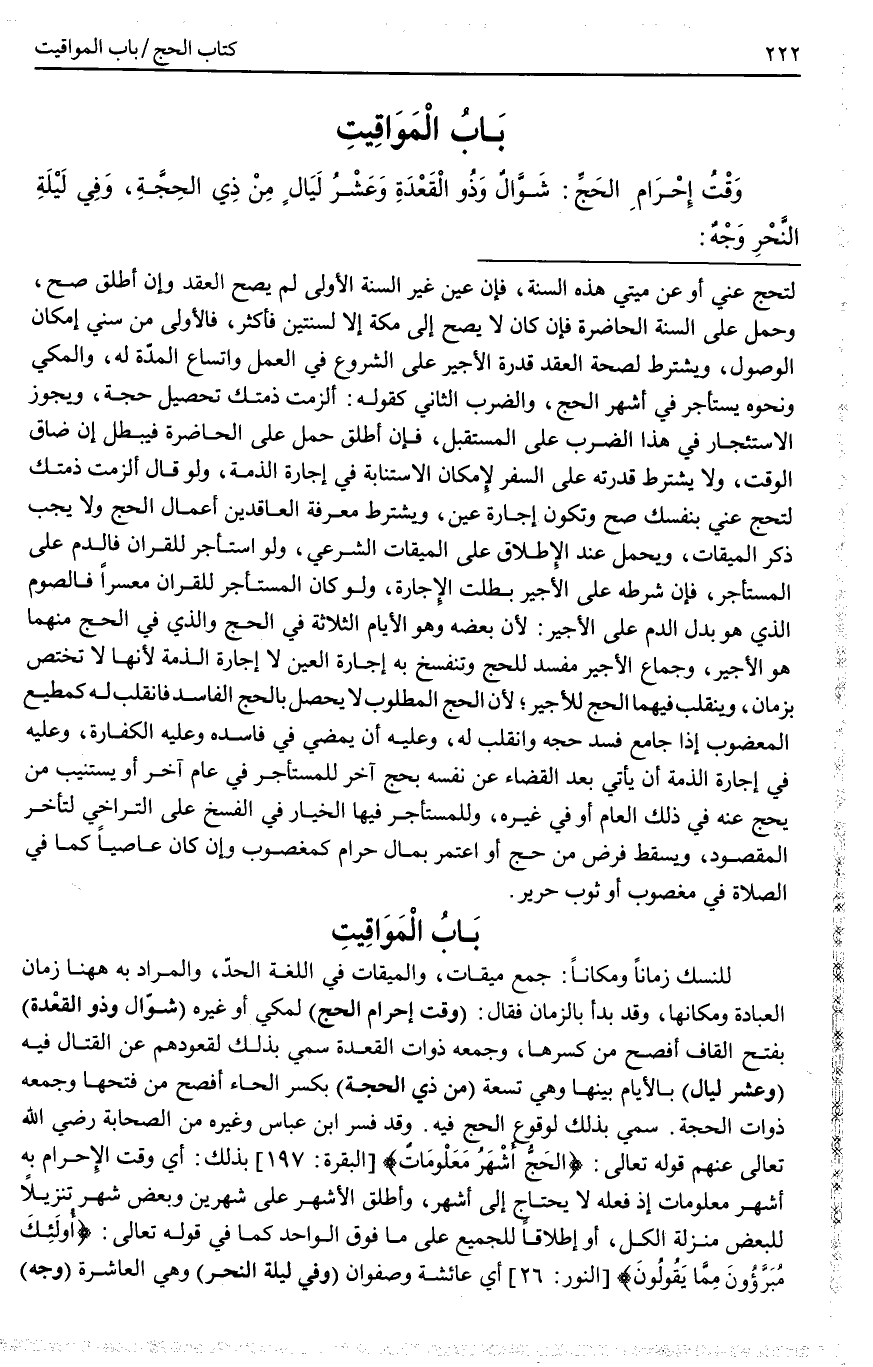(بَابُ الْمَوَاقِيتِ) لِلنُّسُكِ زَمَانًا وَمَكَانًا: جَمْعُ مِيقَاتٍ، وَالْمِيقَاتُ فِي اللُّغَةِ الْحَدُّ، وَالْمُرَادُ بِهِ هَهُنَا زَمَانُ الْعِبَادَةِ وَمَكَانُهَا، وَقَدْ بَدَأَ بِالزَّمَانِ فَقَالَ: (وَقْتُ إحْرَامِ الْحَجِّ) لِمَكِّيٍّ أَوْ غَيْرِهِ (شَوَّالٌ وَذُو الْقَعْدَةِ) بِفَتْحِ الْقَافِ أَفْصَحُ مِنْ كَسْرِهَا، وَجَمْعُهُ ذَوَاتُ الْقَعْدَةِ سُمِّيَ بِذَلِكَ لِقُعُودِهِمْ عَنْ الْقِتَالِ فِيهِ (وَعَشْرُ لَيَالٍ) بِالْأَيَّامِ بَيْنَهَا وَهِيَ تِسْعَةٌ (مِنْ ذِي الْحِجَّةِ) بِكَسْرِ الْحَاءِ أَفْصَحُ مِنْ فَتْحِهَا وَجَمْعُهُ ذَوَاتُ الْحِجَّةِ. سُمِّيَ بِذَلِكَ لِوُقُوعِ الْحَجِّ فِيهِ. وَقَدْ فَسَّرَ ابْنُ عَبَّاسٍ وَغَيْرُهُ مِنْ الصَّحَابَةِ - رَضِيَ اللَّهُ تَعَالَى عَنْهُمْ - قَوْله تَعَالَى: {الْحَجُّ أَشْهُرٌ مَعْلُومَاتٌ} [البقرة: 197] الْبَقَرَةَ بِذَلِكَ: أَيْ وَقْتُ الْإِحْرَامِ بِهِ أَشْهُرٌ مَعْلُومَاتٌ إذْ فِعْلُهُ لَا يَحْتَاجُ إلَى أَشْهُرٍ، وَأَطْلَقَ الْأَشْهُرَ عَلَى شَهْرَيْنِ وَبَعْضِ شَهْرٍ تَنْزِيلًا لِلْبَعْضِ مَنْزِلَةَ الْكُلِّ، أَوْ إطْلَاقًا لِلْجَمِيعِ عَلَى مَا فَوْقَ الْوَاحِدِ كَمَا فِي قَوْله تَعَالَى: {أُولَئِكَ مُبَرَّءُونَ مِمَّا يَقُولُونَ} [النور: 26] [النُّورَ] أَيْ عَائِشَةُ وَصَفْوَانُ (وَفِي لَيْلَةِ النَّحْرِ) وَهِيَ الْعَاشِرَةُ (وَجْهٌ)