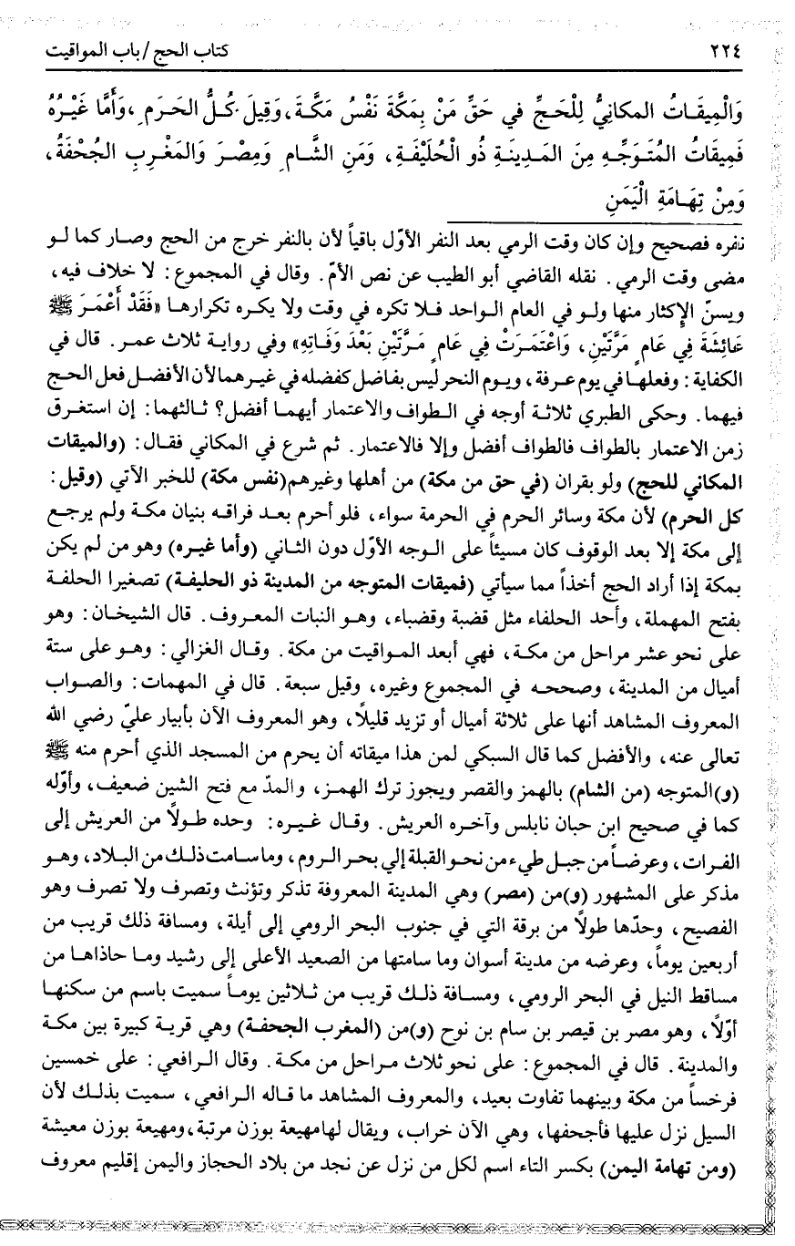 ثُمَّ شَرَعَ فِي الْمَكَانِيِّ فَقَالَ: (وَالْمِيقَاتُ الْمَكَانِيُّ لِلْحَجِّ) وَلَوْ بِقِرَانٍ (فِي حَقِّ مَنْ بِمَكَّةَ) مِنْ أَهْلِهَا وَغَيْرِهِمْ (نَفْسُ مَكَّةَ) لِلْخَبَرِ الْآتِي (وَقِيلَ: كُلُّ الْحَرَمِ) لِأَنَّ مَكَّةَ وَسَائِرَ الْحَرَمِ فِي الْحُرْمَةِ سَوَاءٌ، فَلَوْ أَحْرَمَ بَعْدَ فِرَاقِهِ بُنْيَانَ مَكَّةَ وَلَمْ يَرْجِعْ إلَى مَكَّةَ إلَّا بَعْدَ الْوُقُوفِ كَانَ مُسِيئًا عَلَى الْوَجْهِ الْأَوَّلِ دُونَ الثَّانِي (وَأَمَّا غَيْرُهُ) وَهُوَ مَنْ لَمْ يَكُنْ بِمَكَّةَ إذَا أَرَادَ الْحَجَّ أَخْذًا مِمَّا سَيَأْتِي (فَمِيقَاتُ الْمُتَوَجِّهِ مِنْ الْمَدِينَةِ ذُو الْحُلَيْفَةِ) تَصْغِيرُ الْحَلْفَةِ بِفَتْحِ الْمُهْمَلَةِ، وَأَحَدُ الْحَلْفَاءِ مِثْلُ قَضْبَةٍ وَقَضْبَاءَ، وَهُوَ النَّبَاتُ الْمَعْرُوفُ. قَالَ الشَّيْخَانِ: وَهُوَ عَلَى نَحْوِ عَشْرِ مَرَاحِلَ مِنْ مَكَّةَ، فَهِيَ أَبْعَدُ الْمَوَاقِيتِ مِنْ مَكَّةَ. وَقَالَ الْغَزَالِيُّ: وَهُوَ عَلَى سِتَّةِ أَمْيَالٍ مِنْ الْمَدِينَةِ، وَصَحَّحَهُ فِي الْمَجْمُوعِ وَغَيْرِهِ، وَقِيلَ سَبْعَةٌ. قَالَ فِي الْمُهِمَّاتِ: وَالصَّوَابُ الْمَعْرُوفُ الْمُشَاهَدُ أَنَّهَا عَلَى ثَلَاثَةِ أَمْيَالٍ أَوْ تَزِيدُ قَلِيلًا، وَهُوَ الْمَعْرُوفُ الْآنَ بِأَبْيَارِ عَلِيٍّ - رَضِيَ اللَّهُ تَعَالَى عَنْهُ -، وَالْأَفْضَلُ كَمَا قَالَ السُّبْكِيُّ لِمَنْ هَذَا مِيقَاتُهُ أَنْ يُحْرِمَ مِنْ الْمَسْجِدِ الَّذِي أَحْرَمَ مِنْهُ - صَلَّى اللَّهُ عَلَيْهِ وَسَلَّمَ - (وَ) الْمُتَوَجِّهِ (مِنْ الشَّامِ) بِالْهَمْزِ وَالْقَصْرِ وَيَجُوزُ تَرْكُ الْهَمْزِ، وَالْمَدِّ مَعَ فَتْحِ الشِّينِ ضَعِيفٌ. وَأَوَّلُهُ كَمَا فِي صَحِيحِ ابْنِ حِبَّانَ نَابُلُسُ وَآخِرُهُ الْعَرِيشُ. وَقَالَ غَيْرُهُ: وَحَدُّهُ طُولًا مِنْ الْعَرِيشِ إلَى الْفُرَاتِ، وَعَرْضًا مِنْ جَبَلِ طَيِّئٍ مِنْ نَحْوِ الْقِبْلَةِ إلَى بَحْرِ الرُّومِ، وَمَا سَامَتْ ذَلِكَ مِنْ الْبِلَادِ، وَهُوَ مُذَكَّرٌ عَلَى الْمَشْهُورِ (وَ) مِنْ (مِصْرَ) وَهِيَ الْمَدِينَةُ الْمَعْرُوفَةُ تُذَكَّرُ وَتُؤَنَّثُ وَتُصْرَفُ وَلَا تُصْرَفُ وَهُوَ الْفَصِيحُ، وَحَدُّهَا طُولًا مِنْ بَرْقَةَ الَّتِي فِي جَنُوبِ الْبَحْرِ الرُّومِيِّ إلَى أَيْلَةَ، وَمَسَافَةُ ذَلِكَ قَرِيبٌ مِنْ أَرْبَعِينَ يَوْمًا، وَعَرْضُهُ مِنْ مَدِينَةِ أُسْوَانَ وَمَا سَامَتَهَا مِنْ الصَّعِيدِ الْأَعْلَى إلَى رَشِيدٍ وَمَا حَاذَاهَا مِنْ مَسَاقِطِ النِّيلِ فِي الْبَحْرِ الرُّومِيِّ، وَمَسَافَةُ ذَلِكَ قَرِيبٌ مِنْ ثَلَاثِينَ يَوْمًا سُمِّيَتْ بِاسْمِ مَنْ سَكَنَهَا أَوَّلًا، وَهُوَ مُضَرُ بْنُ قَيْصَرَ بْنِ سَامِ بْنِ نُوحٍ (وَ) مِنْ (الْمَغْرِبِ الْجُحْفَةُ) وَهِيَ قَرْيَةٌ كَبِيرَةٌ بَيْنَ مَكَّةَ وَالْمَدِينَةِ.