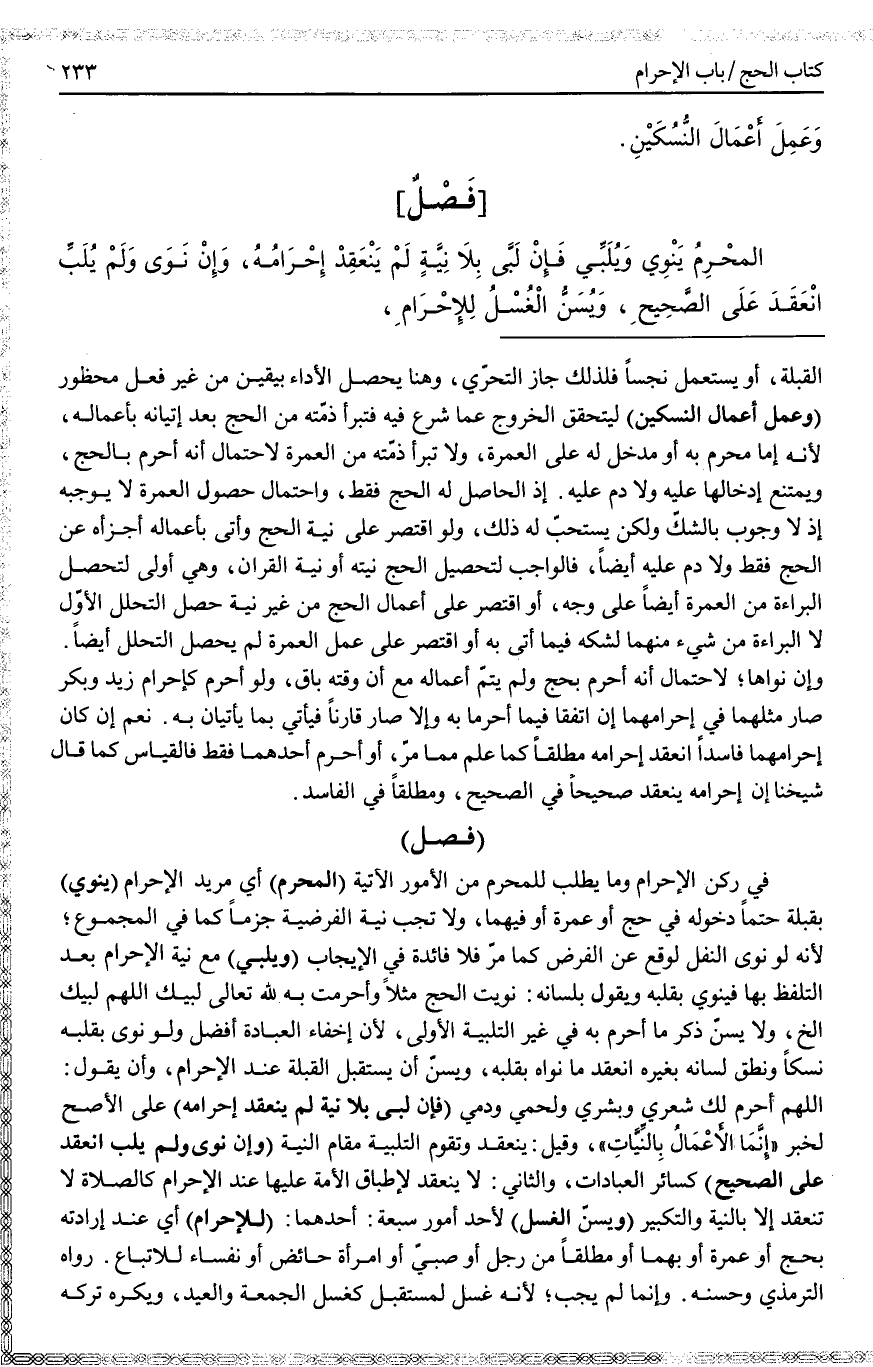 (فَصْلٌ) فِي رُكْنِ الْإِحْرَامِ وَمَا يُطْلَبُ لِلْمُحْرِمِ مِنْ الْأُمُورِ الْآتِيَةِ (الْمُحْرِمُ) أَيْ مُرِيدُ الْإِحْرَامِ (يَنْوِي) بِقَلْبِهِ حَتْمًا دُخُولَهُ فِي حَجٍّ أَوْ عُمْرَةٍ أَوْ فِيهِمَا، وَلَا تَجِبُ نِيَّةُ الْفَرْضِيَّةِ جَزْمًا كَمَا فِي الْمَجْمُوعِ؛ لِأَنَّهُ لَوْ نَوَى النَّفَلَ لَوَقَعَ عَنْ الْفَرْضِ كَمَا مَرَّ فَلَا فَائِدَةَ فِي الْإِيجَابِ (وَيُلَبِّي) مَعَ نِيَّةِ الْإِحْرَامِ بَعْدَ التَّلَفُّظِ بِهَا فَيَنْوِي بِقَلْبِهِ وَيَقُولُ بِلِسَانِهِ: نَوَيْت الْحَجَّ مَثَلًا وَأَحْرَمْت بِهِ لِلَّهِ تَعَالَى لَبَّيْكَ اللَّهُمَّ لَبَّيْكَ إلَخْ، وَلَا يُسَنُّ ذِكْرُ مَا أَحْرَمَ بِهِ فِي غَيْرِ التَّلْبِيَةِ الْأُولَى، لِأَنَّ إخْفَاءَ الْعِبَادَةِ أَفْضَلُ وَلَوْ نَوَى بِقَلْبِهِ نُسُكًا وَنَطَقَ لِسَانُهُ بِغَيْرِهِ انْعَقَدَ مَا نَوَاهُ بِقَلْبِهِ، وَيُسَنُّ أَنْ يَسْتَقْبِلَ الْقِبْلَةَ عِنْدَ الْإِحْرَامِ، وَأَنْ يَقُولَ: اللَّهُمَّ أَحْرَمَ لَكَ شَعْرِي وَبَشَرِي وَلَحْمِي وَدَمِي (فَإِنْ لَبَّى بِلَا نِيَّةٍ لَمْ يَنْعَقِدْ إحْرَامُهُ) عَلَى الْأَصَحِّ لِخَبَرِ «إنَّمَا الْأَعْمَالُ بِالنِّيَّاتِ» ، وَقِيلَ: يَنْعَقِدُ وَتَقُومُ التَّلْبِيَةُ مَقَامَ النِّيَّةِ (وَإِنْ نَوَى وَلَمْ يُلَبِّ انْعَقَدَ عَلَى الصَّحِيحِ) كَسَائِرِ الْعِبَادَاتِ، وَالثَّانِي: لَا يَنْعَقِدُ لِإِطْبَاقِ الْأُمَّةِ عَلَيْهَا عِنْدَ الْإِحْرَامِ كَالصَّلَاةِ لَا تَنْعَقِدُ إلَّا بِالنِّيَّةِ وَالتَّكْبِيرِ.