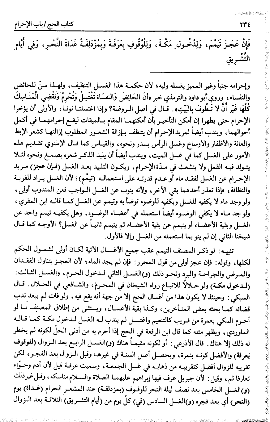 تَنْبِيهٌ: لَوْ ذَكَرَ الْمُصَنِّفُ التَّيَمُّمَ عَقِبَ جَمِيعِ الْأَغْسَالِ الْآتِيَةِ لَكَانَ أَوْلَى لِشُمُولِ الْحُكْمِ لِكُلِّهَا. وَقَوْلُهُ: فَإِنْ عَجَزَ أَوْلَى مِنْ قَوْلِ الْمُحَرَّرِ: فَإِنْ لَمْ يَجِدْ الْمَاءَ؛ لِأَنَّ الْعَجْزَ يَتَنَاوَلُ الْفِقْدَانَ وَالْمَرَضَ وَالْجِرَاحَةَ وَالْبَرْدَ وَنَحْوَ ذَلِكَ (وَ) الْغُسْلُ الثَّانِي لِدُخُولِ الْحَرَمِ، وَالْغُسْلُ الثَّالِثُ: (لِدُخُولِ مَكَّةَ) وَلَوْ حَلَالًا لِلِاتِّبَاعِ رَوَاهُ الشَّيْخَانِ فِي الْمُحْرِمِ، وَالشَّافِعِيُّ فِي الْحَلَالِ. قَالَ السُّبْكِيُّ: وَحِينَئِذٍ لَا يَكُونُ هَذَا مِنْ أَغْسَالِ الْحَجِّ إلَّا مِنْ جِهَةِ أَنَّهُ يَقَعُ فِيهِ، وَلَوْ فَاتَ لَمْ يَبْعُدْ نَدْبُ قَضَائِهِ كَمَا بَحَثَهُ بَعْضُ الْمُتَأَخِّرِينَ، وَكَذَا بَقِيَّةُ الْأَغْسَالِ، وَيُسْتَثْنَى مِنْ إطْلَاقِ الْمُصَنِّفِ، مَا لَوْ أَحْرَمَ الْمَكِّيُّ بِعُمْرَةٍ مِنْ قَرِيبٍ كَالتَّنْعِيمِ وَاغْتَسَلَ لَمْ يُنْدَبْ لَهُ الْغُسْلُ لِدُخُولِ مَكَّةَ كَمَا قَالَهُ الْمَاوَرْدِيُّ، وَيَظْهَرُ مِثْلُهُ كَمَا قَالَ ابْنُ الرِّفْعَةِ فِي الْحَجِّ إذَا أَحْرَمَ بِهِ مِنْ أَدْنَى الْحِلِّ لِكَوْنِهِ لَمْ يَخْطِرْ لَهُ ذَلِكَ إلَّا هُنَاكَ. قَالَ الْأَذْرَعِيُّ: أَوْ لِكَوْنِهِ مُقِيمًا هُنَاكَ (وَ) الْغُسْلُ الرَّابِعُ بَعْدَ الزَّوَالِ (لِلْوُقُوفِ بِعَرَفَةَ) وَالْأَفْضَلُ كَوْنُهُ بِنَمِرَةَ، وَيَحْصُلُ أَصْلُ السُّنَّةِ فِي غَيْرِهَا وَقَبْلَ الزَّوَالِ بَعْدَ الْفَجْرِ، لَكِنْ تَقْرِيبُهُ لِلزَّوَالِ أَفْضَلُ كَتَقْرِيبِهِ مِنْ ذَهَابِهِ فِي غُسْلِ الْجُمُعَةِ، وَسُمِّيَتْ عَرَفَةَ قِيلَ لِأَنَّ آدَمَ وَحَوَّاءَ تَعَارَفَا ثَمَّ، وَقِيلَ: لِأَنَّ جِبْرِيلَ عَرَّفَ فِيهَا إبْرَاهِيمَ - عَلَيْهِمَا الصَّلَاةُ وَالسَّلَامُ - مَنَاسِكَهُ، وَقِيلَ غَيْرُ ذَلِكَ (وَ) الْغُسْلُ الْخَامِسُ بَعْدَ نِصْفِ لَيْلَةِ النَّحْرِ لِلْوُقُوفِ (بِمُزْدَلِفَةَ) عِنْدَ الْمَشْعَرِ الْحَرَامِ (غَدَاةَ) يَوْمِ (النَّحْرِ) أَيْ بَعْدَ فَجْرِهِ (وَ) الْغُسْلُ السَّادِسُ (فِي) كُلِّ يَوْمٍ مِنْ (أَيَّامِ التَّشْرِيقِ) الثَّلَاثَةِ بَعْدَ الزَّوَالِ