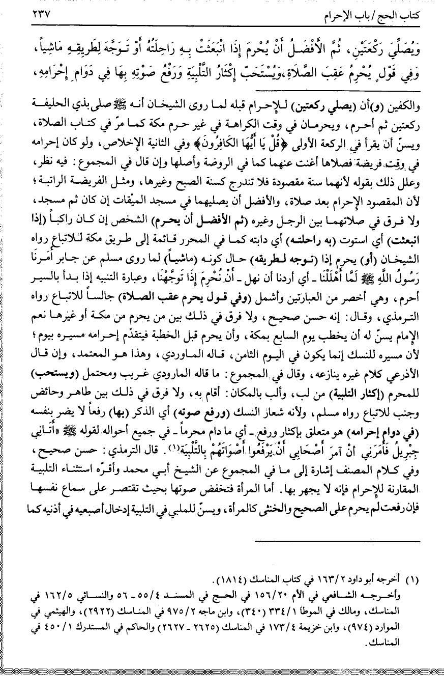 (وَيُسْتَحَبُّ) لِلْمُحْرِمِ (إكْثَارُ التَّلْبِيَةِ) مِنْ لَبَّ، وَأَلَبَّ بِالْمَكَانِ: أَقَامَ بِهِ، وَلَا فَرْقَ فِي ذَلِكَ بَيْنَ طَاهِرٍ وَحَائِضٍ وَجُنُبٍ لِلِاتِّبَاعِ رَوَاهُ مُسْلِمٌ؛ وَلِأَنَّهُ شِعَارُ النُّسُكِ (وَرَفْعُ صَوْتِهِ) أَيْ الذَّكَرِ (بِهَا) رَفْعًا لَا يَضُرُّ نَفْسَهُ (فِي دَوَامِ إحْرَامِهِ) هُوَ مُتَعَلِّقٌ بِإِكْثَارُ وَرَفْعُ - أَيْ مَا دَامَ مُحْرِمًا - فِي جَمِيعِ أَحْوَالِهِ لِقَوْلِهِ - صَلَّى اللَّهُ عَلَيْهِ وَسَلَّمَ - «أَتَانِي جِبْرِيلُ فَأَمَرَنِي أَنْ آمُرَ أَصْحَابِي أَنْ يَرْفَعُوا أَصْوَاتَهُمْ بِالتَّلْبِيَةِ» . قَالَ التِّرْمِذِيُّ: حَسَنٌ صَحِيحٌ.