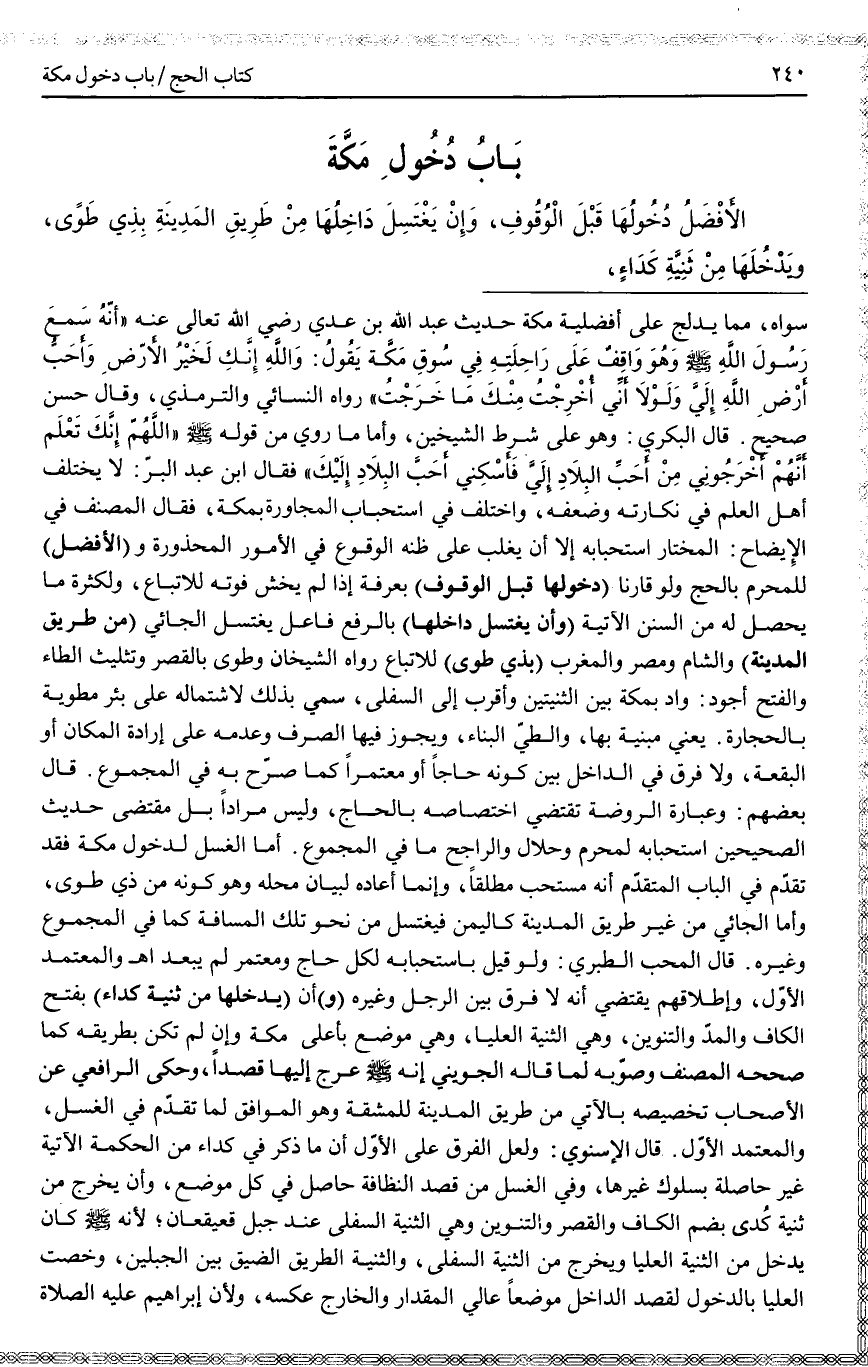 بَابُ دُخُولِ مَكَّةَ الْأَفْضَلُ دُخُولُهَا قَبْلَ الْوُقُوفِ، وَأَنْ يَغْتَسِلَ دَاخِلُهَا مِنْ طَرِيقِ الْمَدِينَةِ بِذِي طَوًى وَيَدْخُلَهَا مِنْ ثَنِيَّةِ كَدَاءٍ،