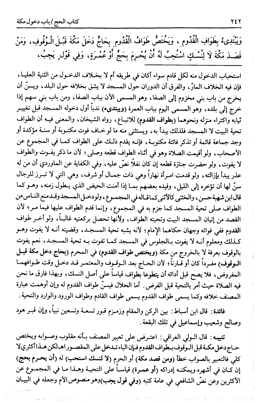 تَنْبِيهٌ: قَالَ الْوَلِيُّ الْعِرَاقِيُّ: اُعْتُرِضَ عَلَى تَعْبِيرِ الْمُصَنِّفِ بِأَنَّهُ مَقْلُوبٌ وَصَوَابُهُ وَيَخْتَصُّ حَاجٌّ دَخَلَ مَكَّةَ قَبْلَ الْوُقُوفِ بِطَوَافِ الْقُدُومِ فَإِنَّ الْبَاءَ تَدْخُلُ عَلَى الْمَقْصُورِ اهـ لَكِنَّ هَذَا أَكْثَرِيٌّ لَا كُلِّيٌّ فَالتَّعْبِيرُ بِالصَّوَابِ خَطَأٌ.