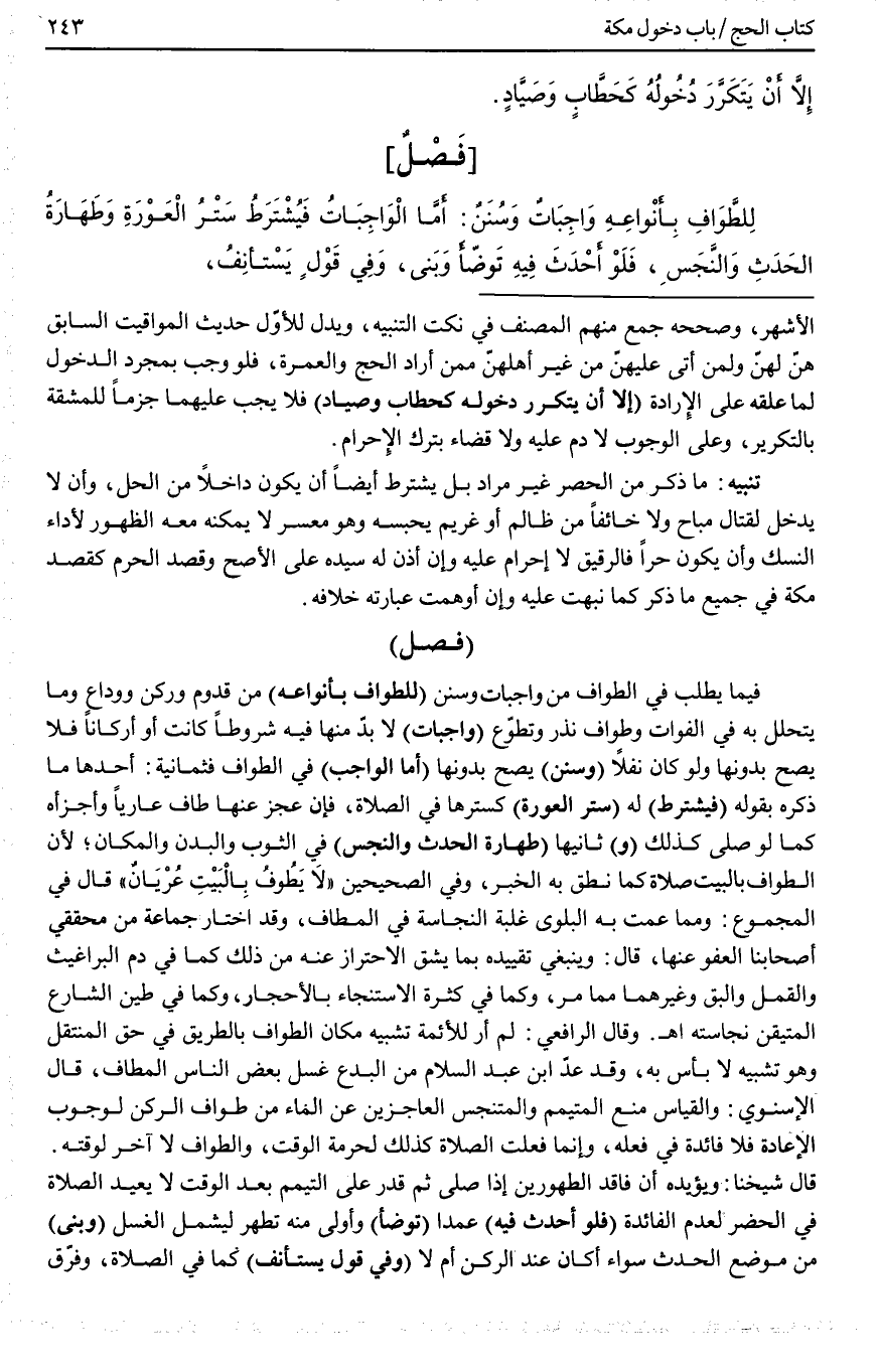 (فَصْلٌ) فِيمَا يُطْلَبُ فِي الطَّوَافِ مِنْ وَاجِبَاتٍ وَسُنَنٍ (لِلطَّوَافِ بِأَنْوَاعِهِ) مِنْ قُدُومٍ وَرُكْنٍ وَوَدَاعٍ وَمَا يَتَحَلَّلُ بِهِ فِي الْفَوَاتِ وَطَوَافِ نَذْرٍ وَتَطَوُّعٍ (وَاجِبَاتٌ) لَا بُدَّ مِنْهَا فِيهِ شُرُوطًا كَانَتْ أَوْ أَرْكَانًا فَلَا يَصِحُّ بِدُونِهَا وَلَوْ كَانَ نَفْلًا (وَسُنَنٌ) يَصِحُّ بِدُونِهَا (أَمَّا الْوَاجِبُ) فِي الطَّوَافِ فَثَمَانِيَةٌ: أَحَدُهَا مَا ذَكَرَهُ بِقَوْلِهِ (فَيُشْتَرَطُ) لَهُ (سَتْرُ الْعَوْرَةِ) كَسَتْرِهَا فِي الصَّلَاةِ، فَإِنْ عَجَزَ عَنْهَا طَافَ عَارِيًّا وَأَجْزَأَهُ كَمَا لَوْ صَلَّى كَذَلِكَ (وَ) ثَانِيهَا (طَهَارَةُ الْحَدَثِ وَالنَّجَسِ) فِي الثَّوْبِ وَالْبَدَنِ وَالْمَكَانِ؛ لِأَنَّ الطَّوَافَ بِالْبَيْتِ صَلَاةٌ كَمَا نَطَقَ بِهِ الْخَبَرُ، وَفِي الصَّحِيحَيْنِ «لَا يَطُوفُ بِالْبَيْتِ عُرْيَانٌ» قَالَ فِي الْمَجْمُوعِ: وَمِمَّا عَمَّتْ بِهِ الْبَلْوَى غَلَبَةُ النَّجَاسَةِ فِي الْمَطَافِ، وَقَدْ اخْتَارَ جَمَاعَةٌ مِنْ مُحَقِّقِي أَصْحَابِنَا الْعَفْوَ عَنْهَا، قَالَ: وَيَنْبَغِي تَقْيِيدُهُ بِمَا يَشُقُّ الِاحْتِرَازُ عَنْهُ مِنْ ذَلِكَ كَمَا فِي دَمِ الْبَرَاغِيثِ وَالْقَمْلِ وَالْبَقِّ وَغَيْرِهِمَا مِمَّا مَرَّ، وَكَمَا فِي كَثْرَةِ الِاسْتِنْجَاءِ بِالْأَحْجَارِ، وَكَمَا فِي طِينِ الشَّارِعِ الْمُتَيَقَّنِ نَجَاسَتُهُ اهـ.
