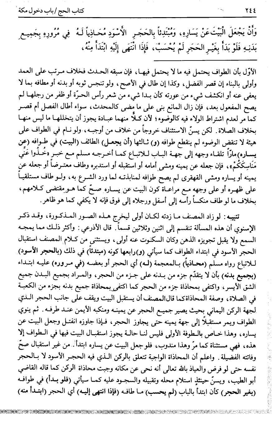 تَنْبِيهٌ: لَوْ زَادَ الْمُصَنِّفُ مَا زِدْته لَكَانَ أَوْلَى لِيُخْرِجَ هَذِهِ الصُّوَرَ الْمَذْكُورَةَ، وَقَدْ ذَكَرَ الْإِسْنَوِيُّ أَنَّ هَذِهِ الْمَسْأَلَةَ تَنْقَسِمُ إلَى اثْنَيْنِ وَثَلَاثِينَ قِسْمًا. قَالَ الْأَذْرَعِيُّ: وَأَكْثَرُ ذَلِكَ مِمَّا يَمُجُّهُ السَّمْعُ وَلَا يَقْبَلُ تَجْوِيزَهُ الذِّهْنُ وَكَانَ السُّكُوتُ عَنْهُ أَوْلَى، وَيُسْتَثْنَى، مِنْ كَلَامِ الْمُصَنِّفِ اسْتِقْبَالُ الْحَجَرِ الْأَسْوَدِ فِي ابْتِدَاءِ الطَّوَافِ كَمَا سَيَأْتِي (وَ) رَابِعُهَا كَوْنُهُ (مُبْتَدِئًا) فِي ذَلِكَ (بِالْحَجَرِ الْأَسْوَدِ) لِلِاتِّبَاعِ رَوَاهُ مُسْلِمٌ (مُحَاذِيًا) بِالْمُعْجَمَةِ (لَهُ) أَيْ الْحَجَرِ أَوْ بَعْضِهِ (فِي مُرُورِهِ) عَلَيْهِ ابْتِدَاءً (بِجَمِيعِ بَدَنِهِ) بِأَنْ لَا يَتَقَدَّمَ جُزْءٌ مِنْ بَدَنِهِ عَلَى جُزْءٍ مِنْ الْحَجَرِ، وَالْمُرَادُ بِجَمِيعِ الْبَدَنِ جَمِيعُ الشِّقِّ الْأَيْسَرِ، وَاكْتَفَى بِمُحَاذَاةِ جُزْءٍ مِنْ الْحَجَرِ كَمَا اكْتَفَى بِمُحَاذَاةِ جَمِيعِ بَدَنِهِ بِجُزْءٍ مِنْ الْكَعْبَةِ فِي الصَّلَاةِ، وَصِفَةُ الْمُحَاذَاةِ كَمَا قَالَ الْمُصَنِّفُ أَنْ يَسْتَقْبِلَ الْبَيْتَ وَيَقِفَ عَلَى جَانِبِ الْحَجَرِ الَّذِي لِجِهَةِ الرُّكْنِ الْيَمَانِيِّ بِحَيْثُ يَصِيرُ جَمِيعُ الْحَجَرِ عَنْ يَمِينِهِ وَمَنْكِبُهُ الْأَيْمَنُ عِنْدَ طَرَفِهِ. ثُمَّ يَنْوِيَ الطَّوَافَ وَيَمُرَّ مُسْتَقْبِلًا إلَى جِهَةِ يَمِينِهِ حَتَّى يُجَاوِزَ الْحَجَرَ، فَإِذَا جَاوَزَهُ انْفَتَلَ وَجَعَلَ الْبَيْتَ عَنْ يَسَارِهِ، وَهَذَا خَاصٌّ بِالطَّوْفَةِ الْأُولَى فَلَيْسَ لَنَا حَالَةٌ يَجُوزُ اسْتِقْبَالُ الْبَيْتِ فِيهَا فِي الطَّوَافِ إلَّا هَذِهِ، فَهِيَ مُسْتَثْنَاةٌ كَمَا مَرَّ وَهَذَا مَنْدُوبٌ، فَلَوْ جَعَلَ الْبَيْتَ عَنْ يَسَارِهِ ابْتَدَأَ. مِنْ غَيْرِ اسْتِقْبَالٍ صَحَّ وَفَاتَتْهُ الْفَضِيلَةُ.