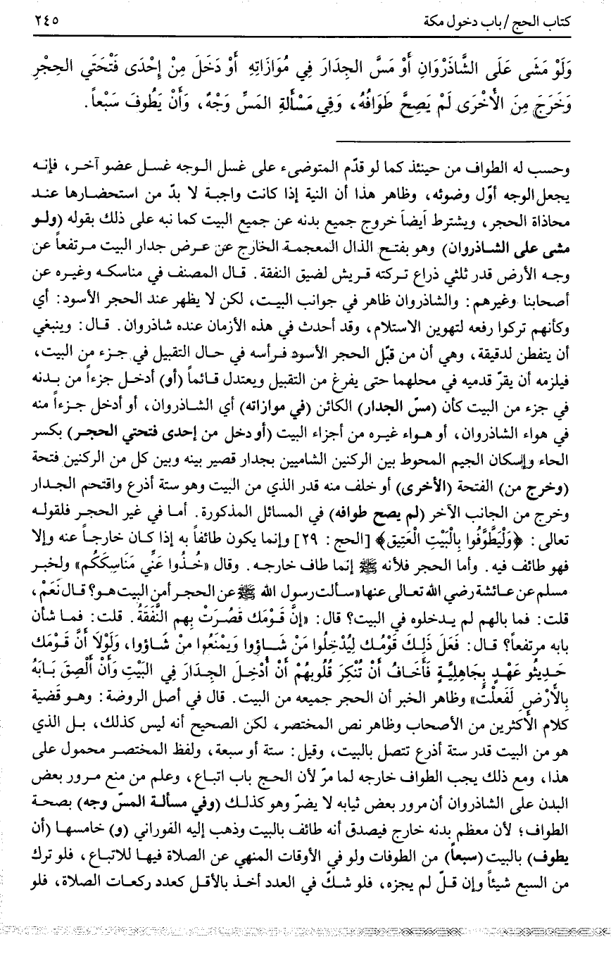 وَلَوْ مَشَى عَلَى الشَّاذَرْوَانِ أَوْ مَسَّ الْجِدَارَ فِي مُوَازَاتِهِ أَوْ دَخَلَ مِنْ إحْدَى فَتْحَتَيْ الْحِجْرِ وَخَرَجَ مِنْ الْأُخْرَى لَمْ يَصِحَّ طَوَافُهُ، وَفِي مَسْأَلَةِ الْمَسِّ وَجْهٌ، وَأَنْ يَطُوفَ سَبْعًا