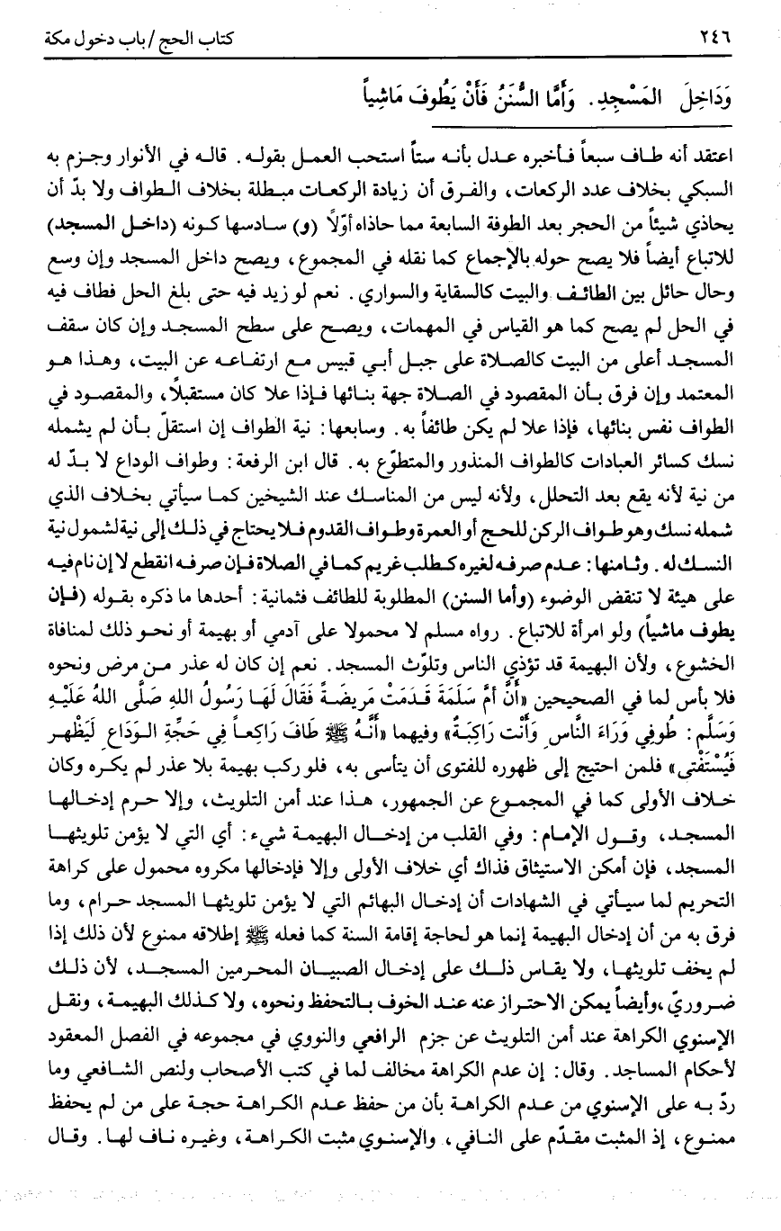 (وَأَمَّا السُّنَنُ) الْمَطْلُوبَةُ لِلطَّائِفِ فَثَمَانِيَةٌ: أَحَدُهَا مَا ذَكَرَهُ بِقَوْلِهِ (فَأَنْ يَطُوفَ مَاشِيًا) وَلَوْ امْرَأَةً لِلِاتِّبَاعِ.
