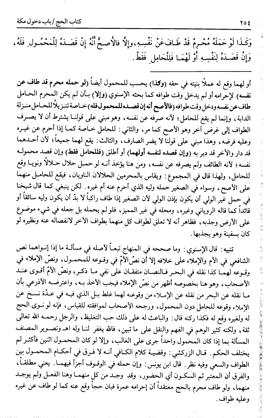 وَتَصْوِيرُ الْمُصَنِّفِ الْمَسْأَلَةَ بِمَا إذَا كَانَ الْمَحْمُولُ وَاحِدًا جَرَى عَلَى الْغَالِبِ، وَإِلَّا لَوْ كَانَ الْمَحْمُولُ اثْنَيْنِ فَأَكْثَرَ لَمْ يَخْتَلِفْ الْحُكْمُ. قَالَ الزَّرْكَشِيُّ: وَقَضِيَّةُ كَلَامِ الْكَافِي أَنَّهُ لَا فَرْقَ فِي أَحْكَامِ الْمَحْمُولِ بَيْنَ الطَّوَافِ وَالسَّعْيِ وَفِيهِ نَظَرٌ.