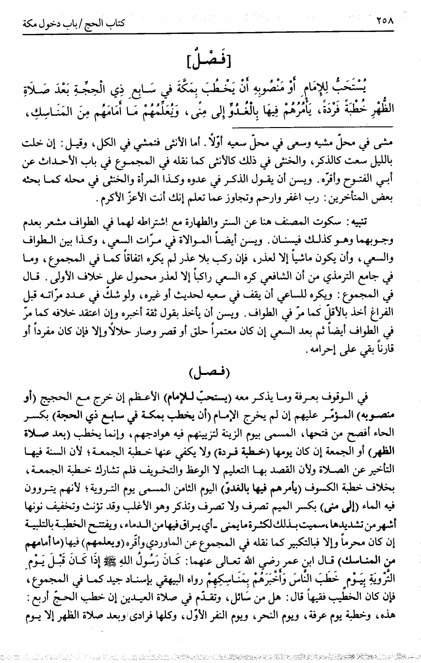 (فَصْلٌ) فِي الْوُقُوفِ بِعَرَفَةَ وَمَا يُذْكَرُ مَعَهُ (يُسْتَحَبُّ لِلْإِمَامِ) الْأَعْظَمِ إنْ خَرَجَ مَعَ الْحَجِيجِ (أَوْ مَنْصُوبِ) الْمُؤَمَّرِ عَلَيْهِمْ إنْ لَمْ يَخْرُجْ الْإِمَامُ (أَنْ يَخْطُبَ بِمَكَّةَ فِي سَابِعِ ذِي الْحِجَّةِ) بِكَسْرِ الْحَاءِ أَفْصَحُ مِنْ فَتْحِهَا، الْمُسَمَّى بِيَوْمِ الزِّينَةِ لِتَزْيِينِهِمْ فِيهِ هَوَادِجَهُمْ، وَإِنَّمَا يَخْطُبُ (بَعْدَ صَلَاةِ الظُّهْرِ) أَوْ الْجُمُعَةِ إنْ كَانَ يَوْمَهَا (خُطْبَةً فَرْدَةً) وَلَا يَكْفِي عَنْهَا خُطْبَةُ الْجُمُعَةِ؛ لِأَنَّ السُّنَّةَ فِيهَا التَّأْخِيرُ عَنْ الصَّلَاةِ وَلِأَنَّ الْقَصْدَ بِهَا التَّعْلِيمُ لَا الْوَعْظُ وَالتَّخْوِيفُ فَلَمْ تُشَارِكْ خُطْبَةَ الْجُمُعَةِ، بِخِلَافِ خُطْبَةِ الْكُسُوفِ (يَأْمُرُهُمْ فِيهَا بِالْغُدُوِّ) الْيَوْمَ الثَّامِنَ الْمُسَمَّى يَوْمَ التَّرْوِيَةِ؛ لِأَنَّهُمْ يَتَرَوُّونَ فِيهِ الْمَاءَ (إلَى مِنًى) بِكَسْرِ الْمِيمِ تُصْرَفُ وَلَا تُصْرَفُ وَتُذَكَّرُ وَهُوَ الْأَغْلَبُ وَقَدْ تُؤَنَّثُ وَتَخْفِيفُ نُونِهَا أَشْهَرُ مِنْ تَشْدِيدِهَا، سُمِّيَتْ بِذَلِكَ لِكَثْرَةِ مَا يُمْنَى - أَيْ يُرَاقُ فِيهَا مِنْ الدِّمَاءِ، وَيَفْتَتِحُ الْخُطْبَةَ بِالتَّلْبِيَةِ إنْ كَانَ مُحْرِمًا وَإِلَّا فَبِالتَّكْبِيرِ كَمَا نَقَلَهُ فِي الْمَجْمُوعِ عَنْ الْمَاوَرْدِيُّ وَأَقَرَّهُ (وَيُعَلِّمُهُمْ) فِيهَا (مَا أَمَامَهُمْ مِنْ الْمَنَاسِكِ) قَالَ ابْنُ عُمَرَ - رَضِيَ اللَّهُ تَعَالَى عَنْهُمَا -: كَانَ رَسُولُ اللَّهِ - صَلَّى اللَّهُ عَلَيْهِ وَسَلَّمَ - «إذَا كَانَ قَبْلَ يَوْمِ التَّرْوِيَةِ بِيَوْمٍ خَطَبَ النَّاسَ وَأَخْبَرَهُمْ بِمَنَاسِكِهِمْ» رَوَاهُ الْبَيْهَقِيُّ بِإِسْنَادٍ جَيِّدٍ كَمَا فِي الْمَجْمُوعِ، فَإِنْ كَانَ الْخَطِيبُ فَقِيهًا قَالَ: هَلْ مِنْ سَائِلٍ، وَتَقَدَّمَ فِي صَلَاةِ الْعِيدَيْنِ أَنَّ خُطَبَ الْحَجِّ أَرْبَعٌ: هَذِهِ، وَخُطْبَةُ يَوْمِ عَرَفَةَ، وَيَوْمِ النَّحْرِ، وَيَوْمِ النَّفْرِ الْأَوَّلِ، وَكُلُّهَا فُرَادَى وَبَعْدَ صَلَاةِ الظُّهْرِ إلَّا يَوْمَ