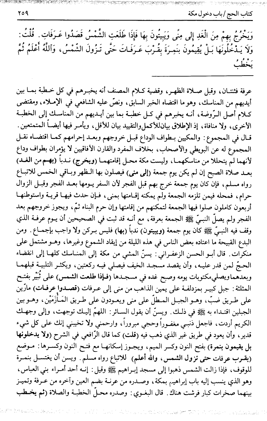 وَيَخْرُجُ بِهِمْ مِنْ الْغَدِ إلَى مِنًى وَيَبِيتُونَ بِهَا فَإِذَا طَلَعَتْ الشَّمْسُ قَصَدُوا عَرَفَاتًا. قُلْت: وَلَا يَدْخُلُونَهَا بَلْ يُقِيمُونَ بِنَمِرَةَ بِقُرْبِ عَرَفَاتٍ حَتَّى تَزُولَ الشَّمْسُ، وَاَللَّهُ أَعْلَمُ ثُمَّ يَخْطُبُ