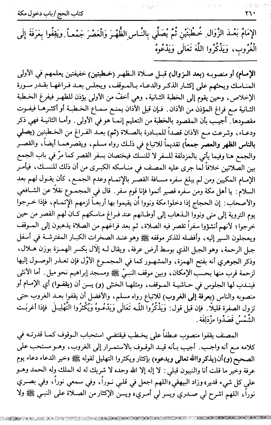 الْإِمَامُ بَعْدَ الزَّوَالِ خُطْبَتَيْنِ ثُمَّ يُصَلِّي بِالنَّاسِ الظُّهْرَ وَالْعَصْرَ جَمْعًا. وَيَقِفُوا بِعَرَفَةَ إلَى الْغُرُوبِ، وَيَذْكُرُوا اللَّهَ تَعَالَى وَيَدْعُوهُ