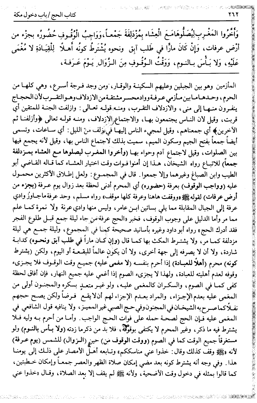 وَحَدُّ عَرَفَةَ مَا جَاوَزَ وَادِي عَرَفَةَ إلَى الْجِبَالِ الْمُقَابِلَةِ مِمَّا يَلِي بَسَاتِينَ ابْنِ عَامِرٍ، وَلَيْسَ مِنْهَا وَادِي عُرَنَةَ وَلَا نَمِرَةَ كَمَا عُلِمَ مِمَّا مَرَّ وَأَمَّا الدَّلِيلُ عَلَى وُجُوبِ الْوُقُوفِ، فَخَبَرُ «الْحَجُّ عَرَفَةَ مَنْ جَاءَ لَيْلَةَ جَمْعٍ قَبْلَ طُلُوعِ الْفَجْرِ فَقَدْ أَدْرَكَ الْحَجَّ» رَوَاهُ أَبُو دَاوُد وَغَيْرُهُ بِأَسَانِيدَ صَحِيحَةٍ كَمَا فِي الْمَجْمُوعِ.