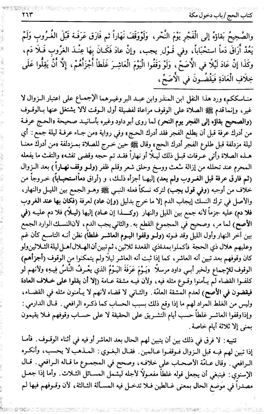 تَنْبِيهٌ: لَا فَرْقَ فِي ذَلِكَ بَيْنَ أَنْ يَتَبَيَّنَ لَهُمْ الْحَالُ بَعْدَ الْعَاشِرِ أَوْ فِيهِ فِي أَثْنَاءِ الْوُقُوفِ. فَأَمَّا إذَا تَبَيَّنَ لَهُمْ فِيهِ قَبْلَ الزَّوَالِ فَوَقَفُوا عَالِمِينَ. فَقَالَ الْبَغَوِيّ: الْمَذْهَبُ لَا يُحْسَبُ، وَأَنْكَرَهُ الرَّافِعِيُّ. وَقَالَ عَامَّةُ الْأَصْحَابِ عَلَى خِلَافِهِ، وَصَحَّحَ فِي الْمَجْمُوعِ مَا قَالَهُ الرَّافِعِيُّ. قَالَ الْإِسْنَوِيُّ: فَيَنْبَغِي أَنْ يُجْعَلَ قَوْلُهُ غَلَطًا مَفْعُولًا لِأَجْلِهِ لِيَشْمَلَ الْمَسَائِلَ الثَّلَاثَ. وَأَمَّا إذَا جُعِلَ مَصْدَرًا فِي مَوْضِعِ الْحَالِ بِمَعْنَى غَالِطِينَ فَلَا تَدْخُلُ فِيهِ الْمَسْأَلَةُ الثَّالِثَةُ، لِأَنَّ وُقُوفَهُمْ فِيهَا لَمْ