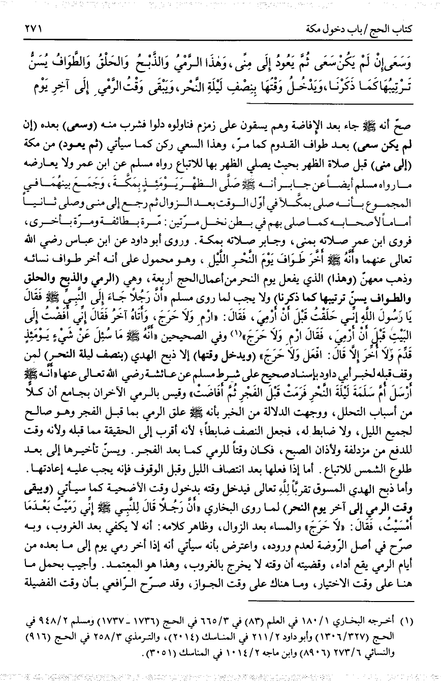 وَرَوَى أَبُو دَاوُد عَنْ ابْنِ عَبَّاسٍ - رَضِيَ اللَّهُ تَعَالَى عَنْهُمَا - «أَنَّهُ - صَلَّى اللَّهُ عَلَيْهِ وَسَلَّمَ - أَخَّرَ طَوَافَ يَوْمِ النَّحْرِ إلَى اللَّيْلِ» ، وَهُوَ مَحْمُولٌ عَلَى أَنَّهُ أَخَّرَ طَوَافَ نِسَائِهِ وَذَهَبَ مَعَهُنَّ (وَهَذَا) الَّذِي يُفْعَلُ يَوْمَ النَّحْرِ مِنْ أَعْمَالِ الْحَجِّ أَرْبَعَةٌ، وَهِيَ (الرَّمْيُ وَالذَّبْحُ وَالْحَلْقُ وَالطَّوَافُ يُسَنُّ تَرْتِيبُهَا كَمَا ذَكَرْنَا) وَلَا يَجِبُ لِمَا رَوَى مُسْلِمٌ «أَنَّ رَجُلًا جَاءَ إلَى النَّبِيِّ - صَلَّى اللَّهُ عَلَيْهِ وَسَلَّمَ - فَقَالَ يَا رَسُولَ اللَّهِ إنِّي حَلَقْت قَبْلَ أَنْ أَرْمِيَ، فَقَالَ: ارْمِ وَلَا حَرَجَ، وَأَتَاهُ آخَرُ فَقَالَ إنِّي أَفَضْت إلَى الْبَيْتِ قَبْلَ أَنْ أَرْمِيَ، فَقَالَ ارْمِ وَلَا حَرَجَ» وَفِي الصَّحِيحَيْنِ «أَنَّهُ - صَلَّى اللَّهُ عَلَيْهِ وَسَلَّمَ - مَا سُئِلَ عَنْ شَيْءٍ يَوْمَئِذٍ قُدِّمَ وَلَا أُخِّرَ إلَّا قَالَ: افْعَلْ وَلَا حَرَجَ» (وَيَدْخُلُ وَقْتُهَا) إلَّا ذَبْحَ الْهَدْيِ (بِنِصْفِ لَيْلَةِ النَّحْرِ) لِمَنْ وَقَفَ قَبْلَهُ لِخَبَرِ أَبِي دَاوُد بِإِسْنَادٍ صَحِيحٍ عَلَى شَرْطِ مُسْلِمٍ عَنْ عَائِشَةَ - رَضِيَ اللَّهُ تَعَالَى عَنْهَا - «أَنَّهُ - صَلَّى اللَّهُ عَلَيْهِ وَسَلَّمَ - أَرْسَلَ أُمَّ سَلَمَةَ لَيْلَةَ النَّحْرِ فَرَمَتْ قَبْلَ الْفَجْرِ ثُمَّ أَفَاضَتْ» وَقِيسَ بِالرَّمْيِ الْآخَرَانِ بِجَامِعِ أَنَّ كُلًّا مِنْ أَسْبَابِ التَّحَلُّلِ، وَوُجِّهَتْ الدَّلَالَةُ مِنْ الْخَبَرِ بِأَنَّهُ - صَلَّى اللَّهُ عَلَيْهِ وَسَلَّمَ - عَلَّقَ الرَّمْيَ بِمَا قَبْلَ الْفَجْرِ وَهُوَ صَالِحٌ لِجَمِيعِ اللَّيْلِ، وَلَا ضَابِطَ لَهُ، فَجُعِلَ النِّصْفُ ضَابِطًا؛ لِأَنَّهُ أَقْرَبُ إلَى الْحَقِيقَةِ مِمَّا قَبْلَهُ وَلِأَنَّهُ وَقْتٌ لِلدَّفْعِ مِنْ مُزْدَلِفَةَ وَلِأَذَانِ الصُّبْحِ، فَكَانَ وَقْتًا لِلرَّمْيِ كَمَا بَعْدَ الْفَجْرِ. وَيُسَنُّ تَأْخِيرُهَا إلَى بَعْدِ طُلُوعِ الشَّمْسِ لِلِاتِّبَاعِ. أَمَّا إذَا فَعَلَهَا بَعْدَ انْتِصَافِ اللَّيْلِ وَقَبْلَ الْوُقُوفِ فَإِنَّهُ يَجِبُ عَلَيْهِ إعَادَتُهَا.
